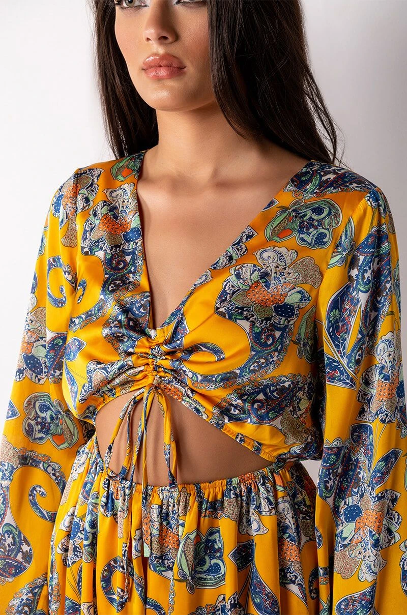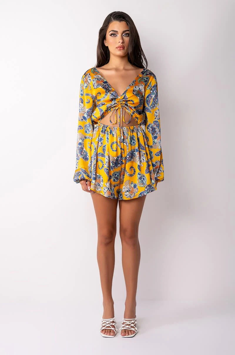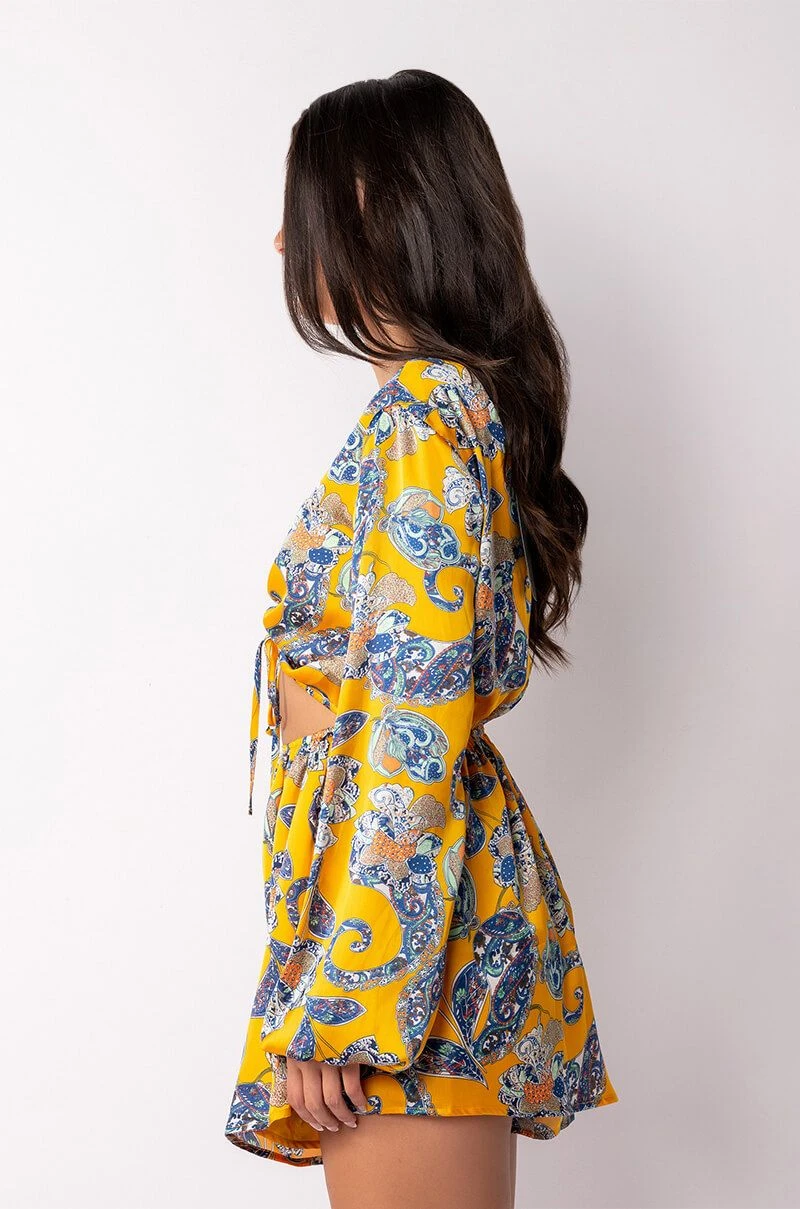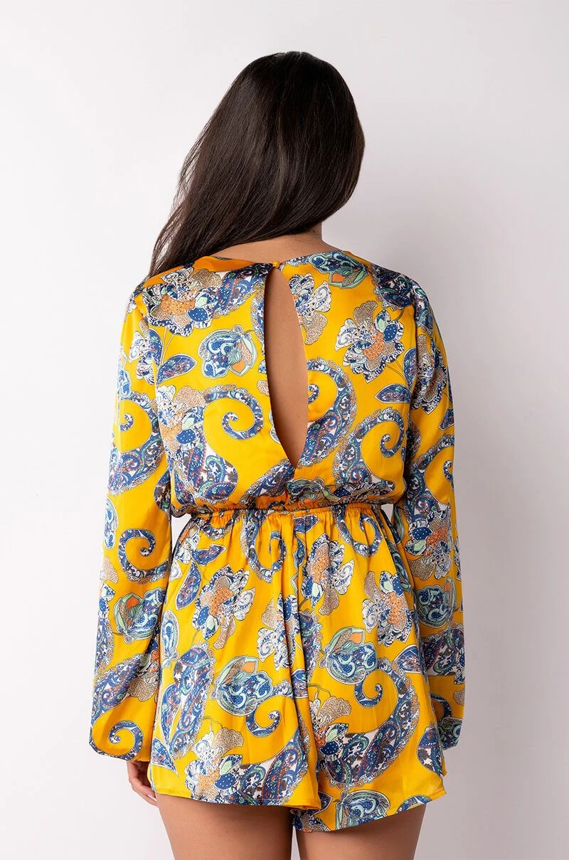 The AKIRA Label Admit It Long Sleeve Printed Romper With Cut Out is made from a satiny fabrication and features an abstract paisley-inspired print, a plunging neckline, long blouson sleeves, ruched chest detailing with ties, a sexy waist cut out, a thin elastic waistband, attached shorts, polyester lining, and a keyhole back with button closure.
