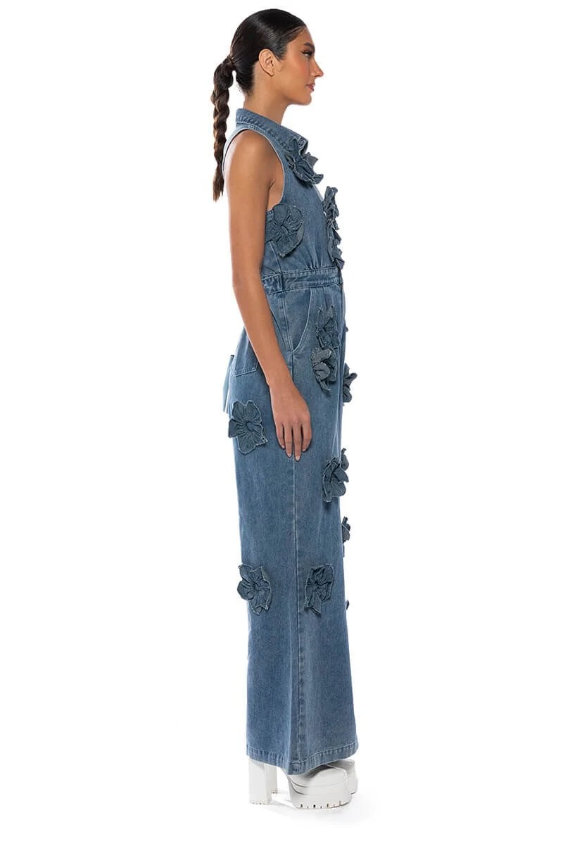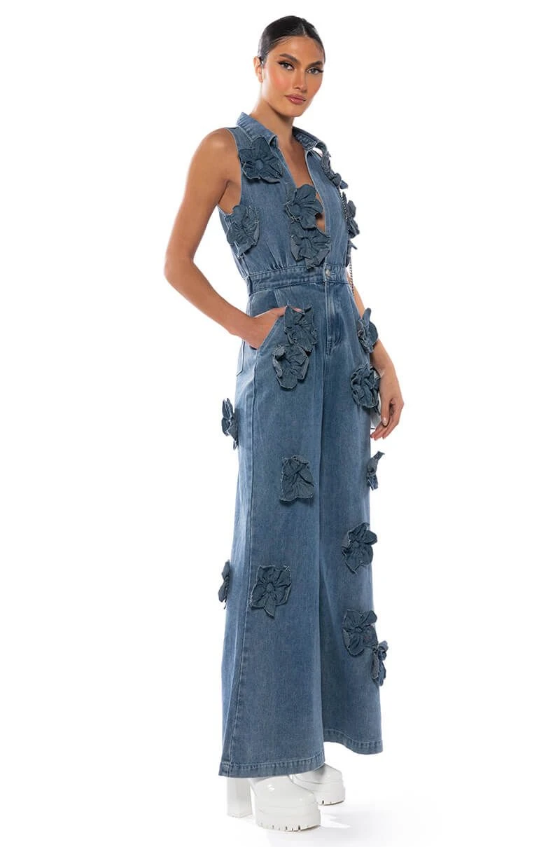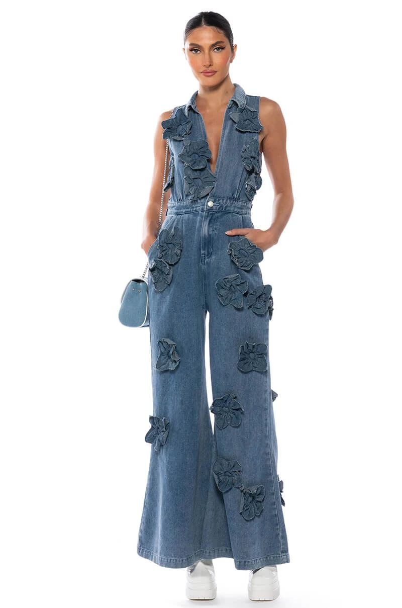 The AKIRA Label After The Storm Floral Denim Jumpsuit features a structured denim fabrication, a plunging neckline, pointed collar, floral denim accents throughout, and a sleeveless silhouette. Complete with extra wide pant legs, a four pocket design, an adjustable belt at the back waist, and a zip button front closure. Style with platform sandals and a beret, for a parisian chic look.