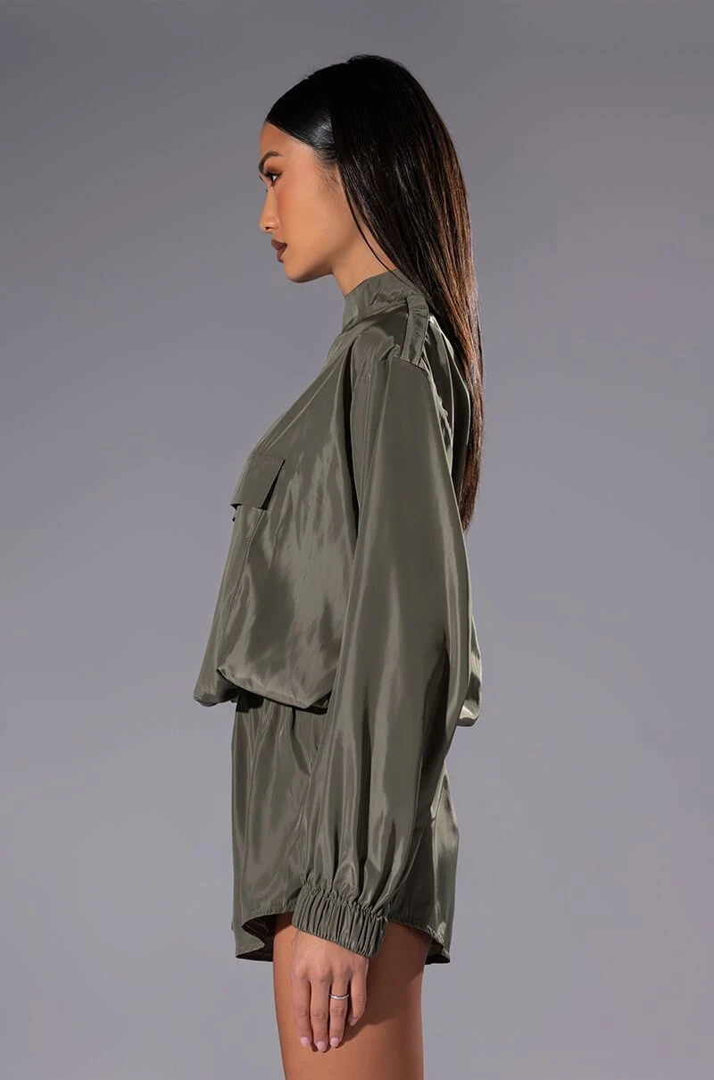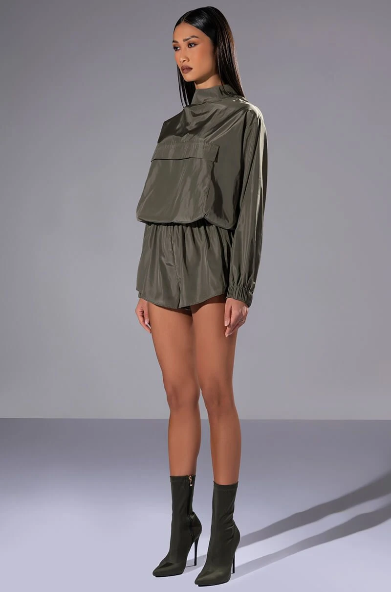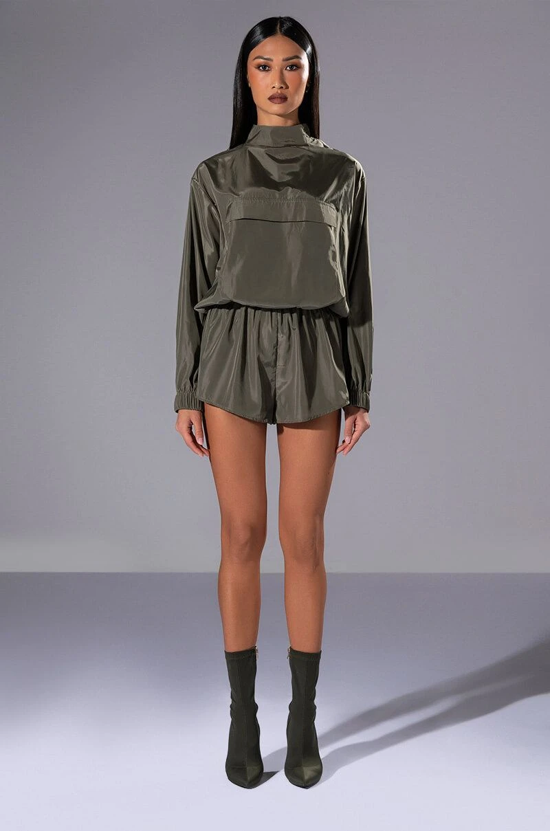 Slay the day in The AKIRA Label All Day Errands Lightweight Romper In Olive! This slick piece is made from a smooth, lightweight fabrication and features a mock neckline, long sleeves with elastic cuffs, a mock front flap pocket, an elastic waist, attached shorts with mesh lining, and tonal back zipper, shoulder, and Velcro neck closures.