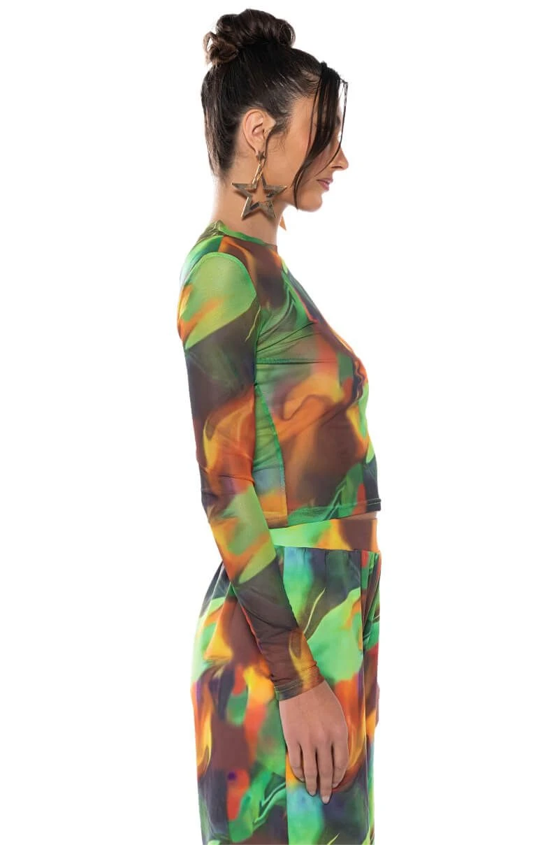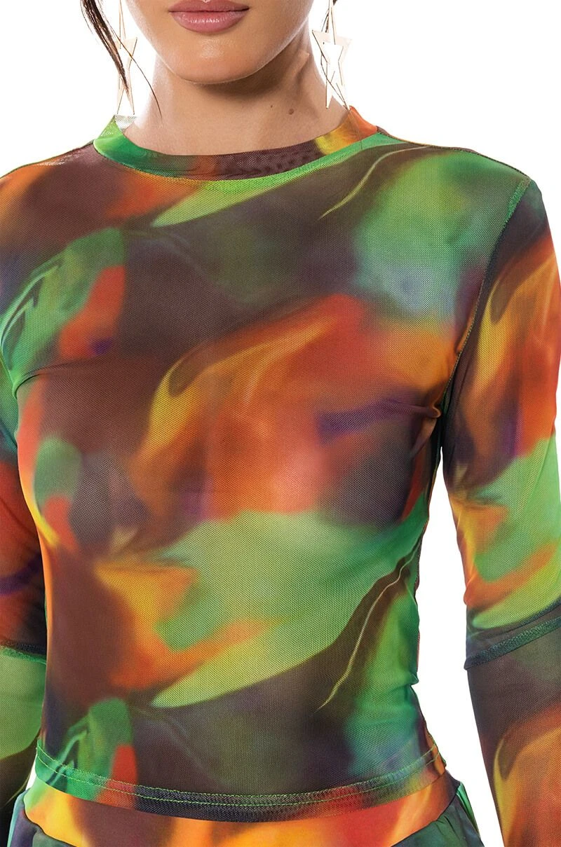 The AKIRA Label All Natural Mesh Long Sleeve is a long sleeved, sheer mesh top complete with an abstract graphic print design, a mock neckline, and a waist-length cut. Pair with the coordinating AKIRA Label All Natural Wide Leg Pant to complete the look!
