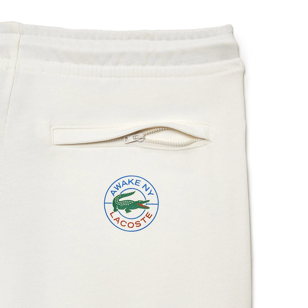 - Elasticized leg bottoms, pockets on side and pocket in back, Lacoste x Awake logo on back