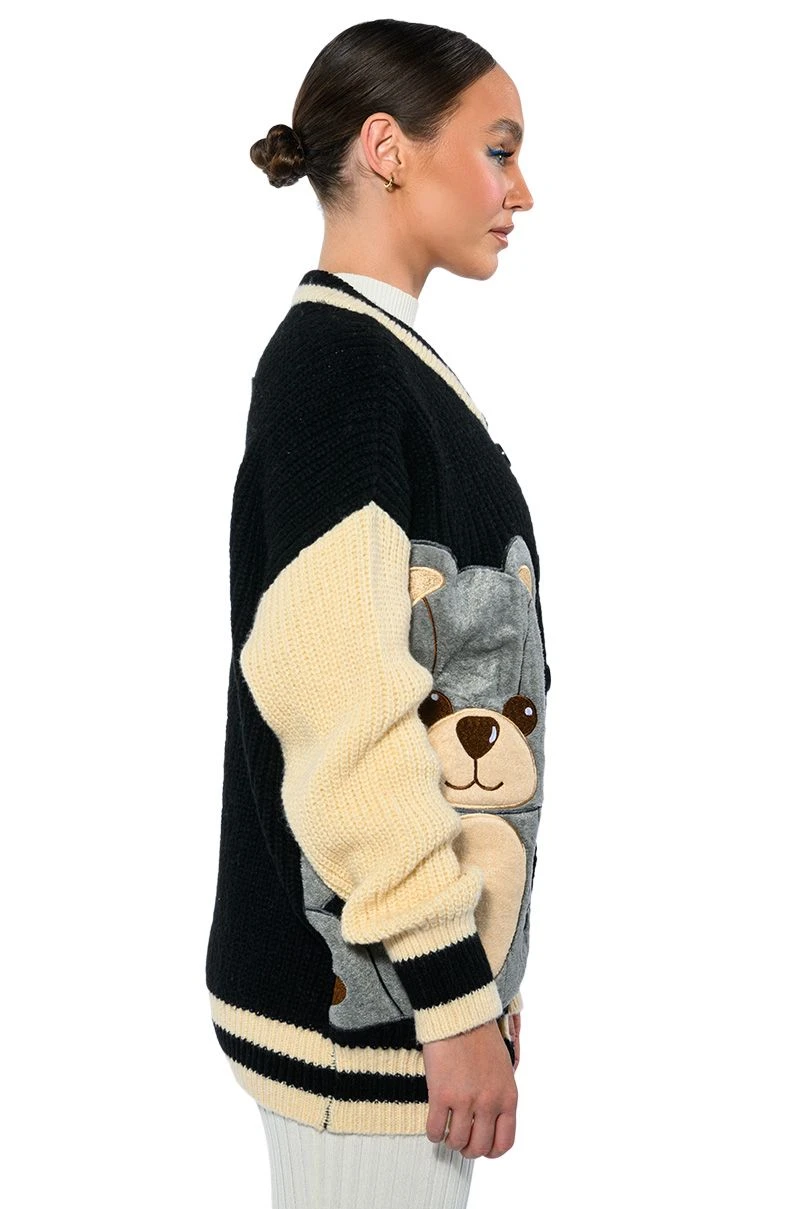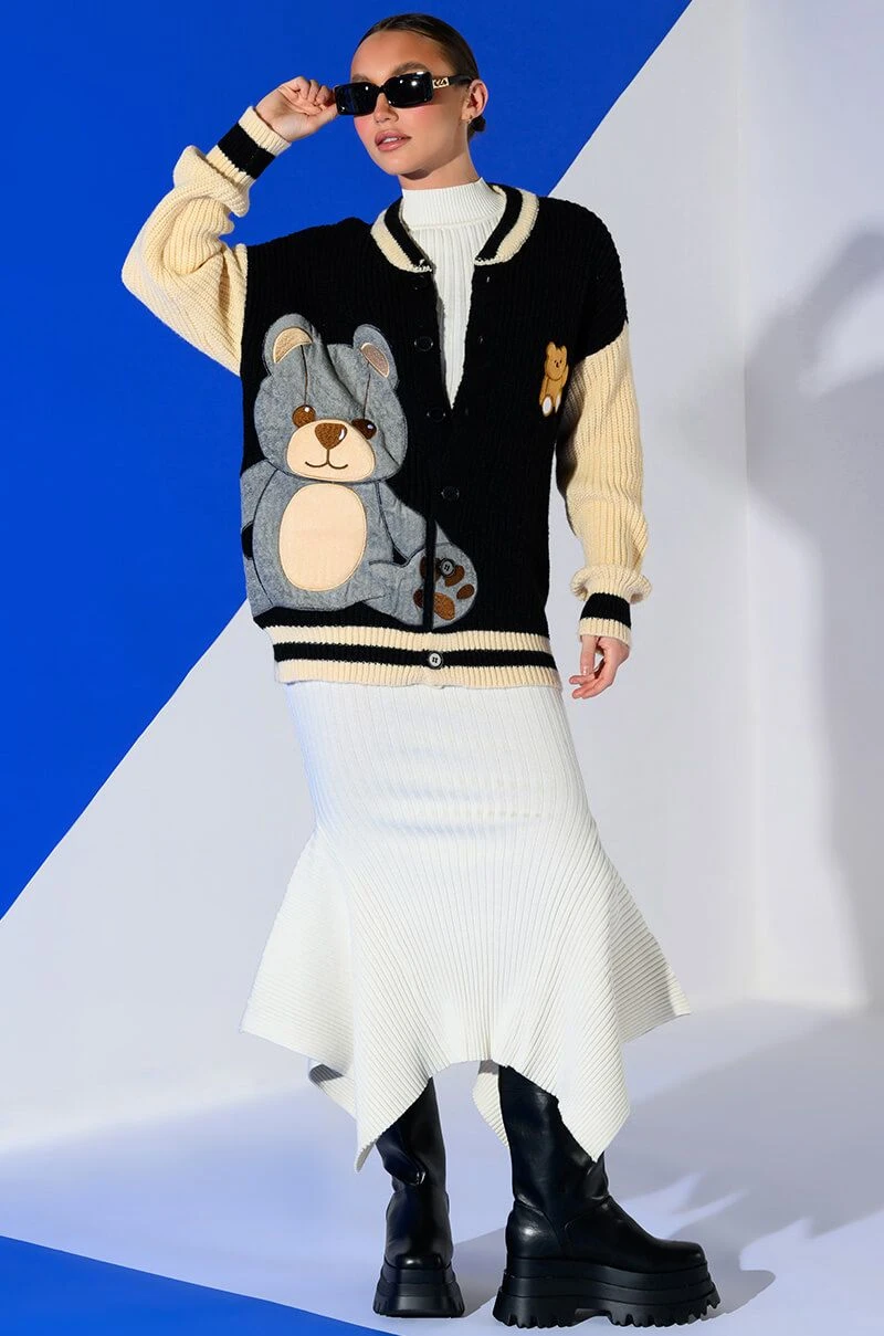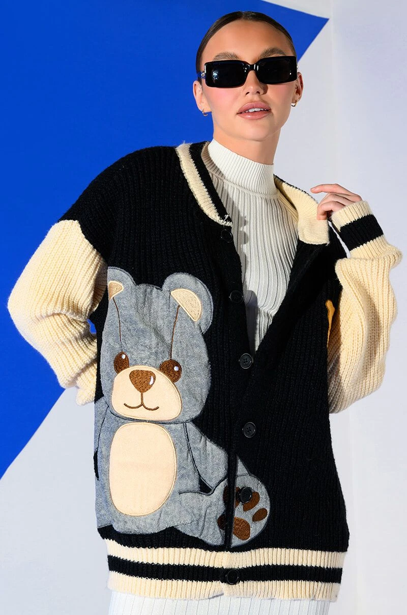 The Akira Label Beary Cozy Knitted Cardigan is an ultra soft knit sweater featuring long sleeves and a varsity jacket-inspired design. Complete with a button down front, striped ribbed knit trim, a contrast collar, and a fuzzy embroidered bear front patch design. Pair with a cropped tank, straight leg pants, and ankle booties!