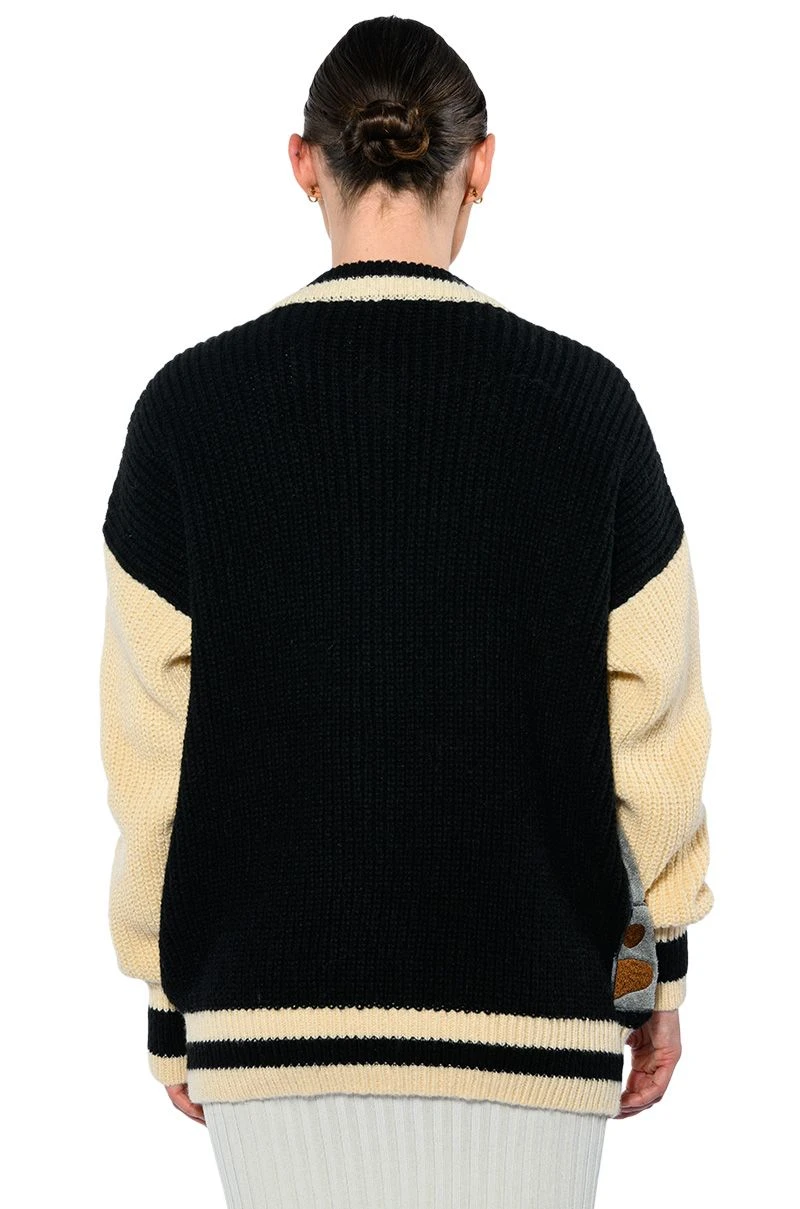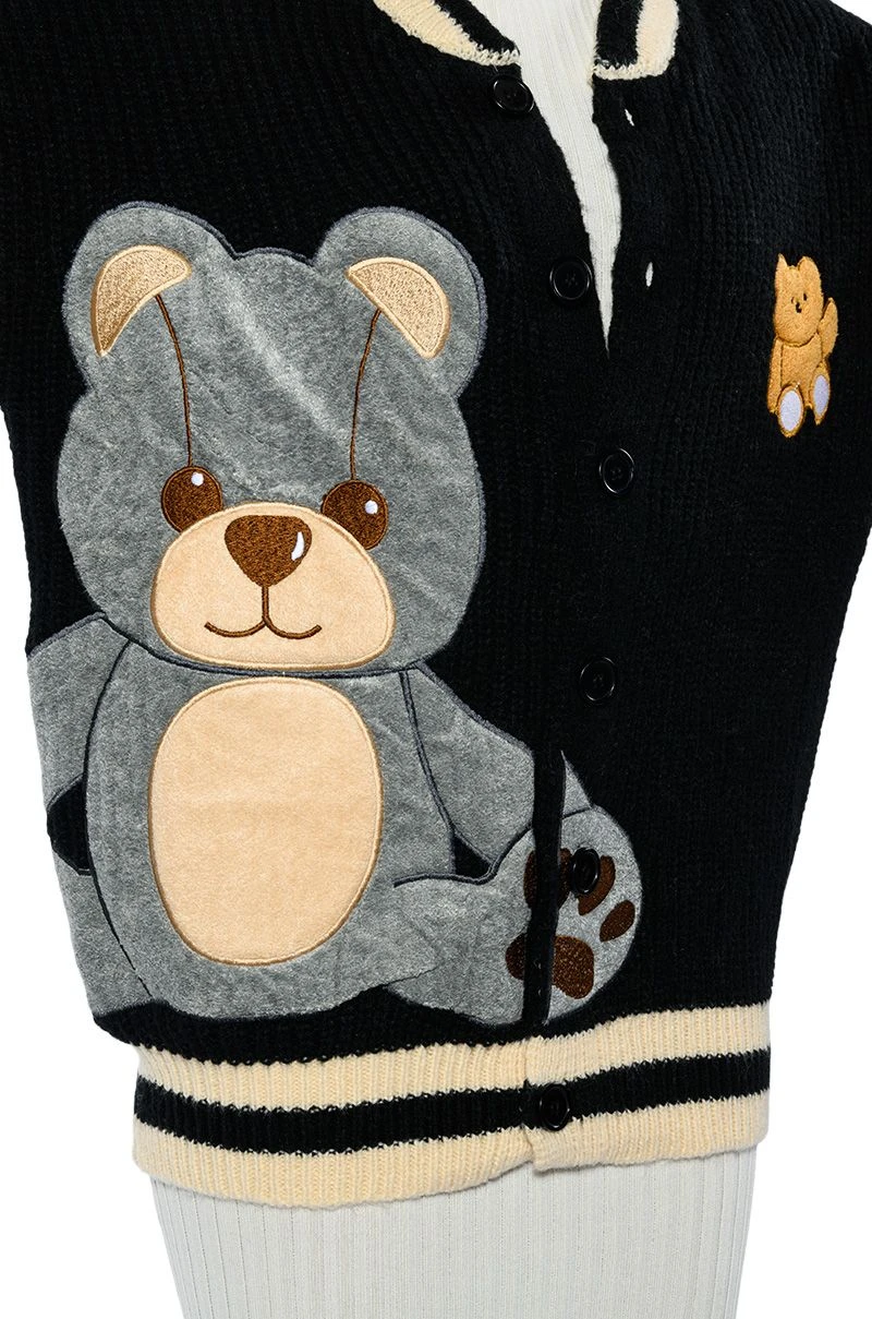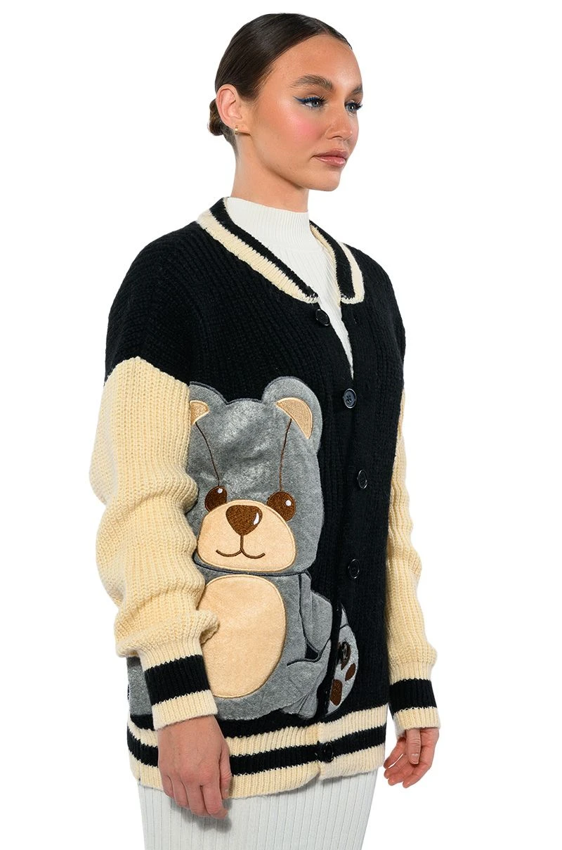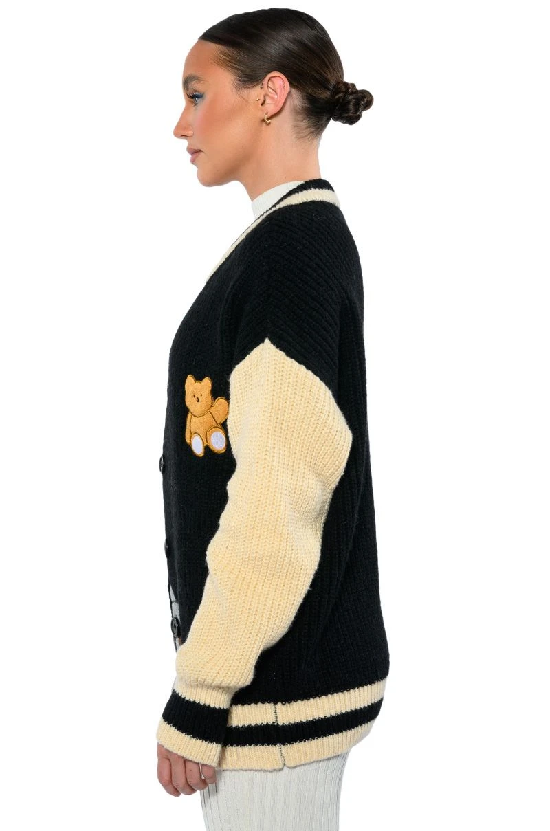 The Akira Label Beary Cozy Knitted Cardigan is an ultra soft knit sweater featuring long sleeves and a varsity jacket-inspired design. Complete with a button down front, striped ribbed knit trim, a contrast collar, and a fuzzy embroidered bear front patch design. Pair with a cropped tank, straight leg pants, and ankle booties!