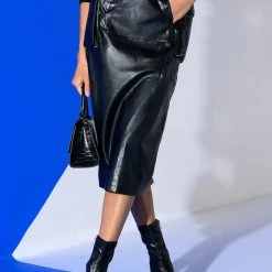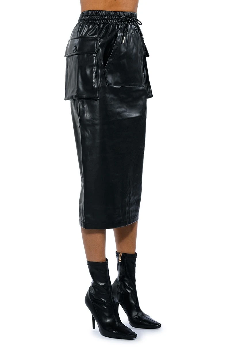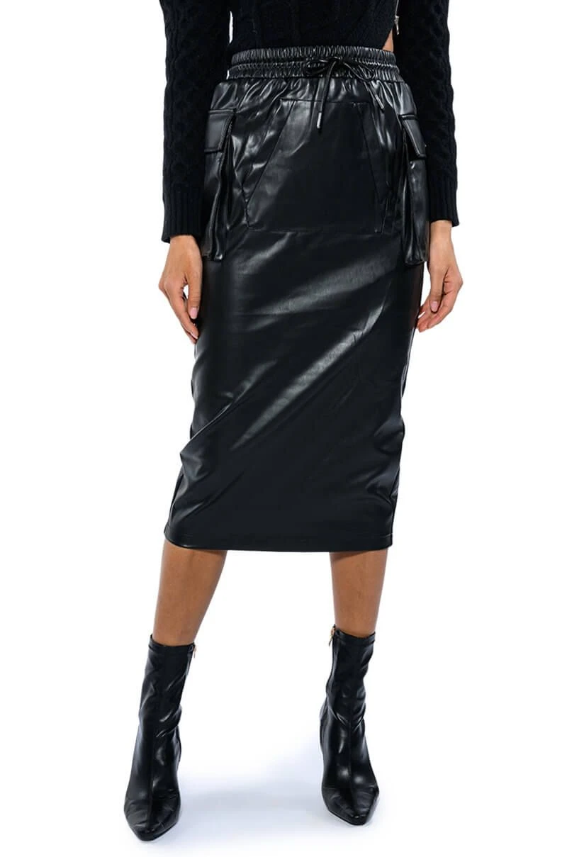 The AKIRA Label Begin Again Faux Leather Midi Skirt features a wide smocked elastic waistband, cargo style side pockets, and a front kangaroo pouch pocket. Complete with silver capped waist drawstrings and a vented back slit for easy movement. Dress it up with a sexy crop tank and a pair of stiletto heel ankle booties for a night out and about.