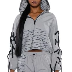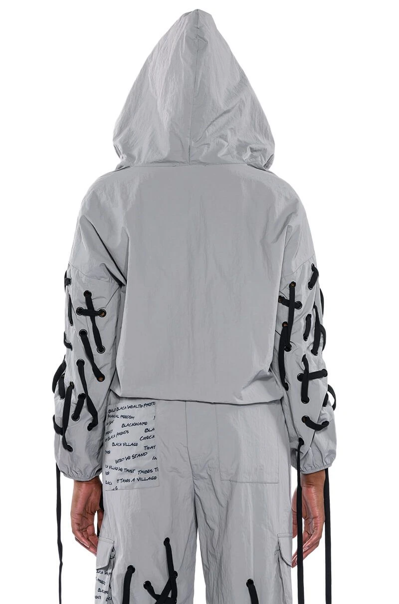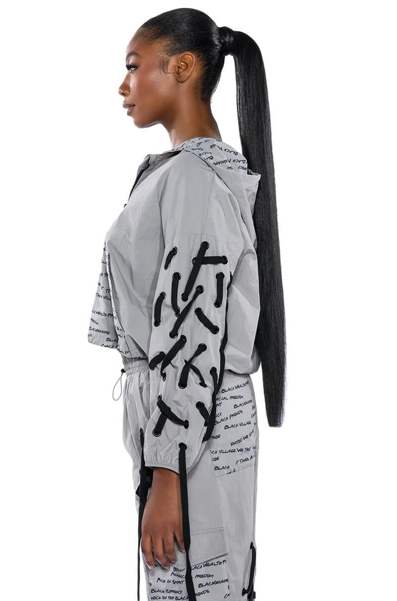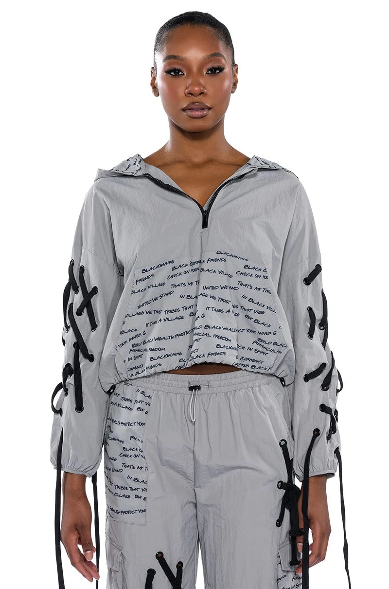 The AKIRA Label Black Village Foundation Logo Lace Up Detail Cropped Hoodie lightweight nylon windbreaker fabrication, an attached hood, long elastic cinched sleeves, lace up sleeve detailing, a quarter zip front closure, and a slightly cropped cut. Complete with dual adjustable drawstring toggle closures for an adjustable cinched hem, and a text print cargo pocket. Complete with a front zipper closure. The graphic text patterning, designed by activist, “Empire” star, and BVF co-founder Ta’Rhonda Jones, represents BVF’s founding principles and ideals. Text print patterning displays the phrases: