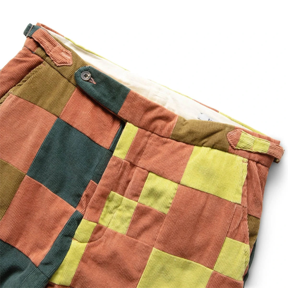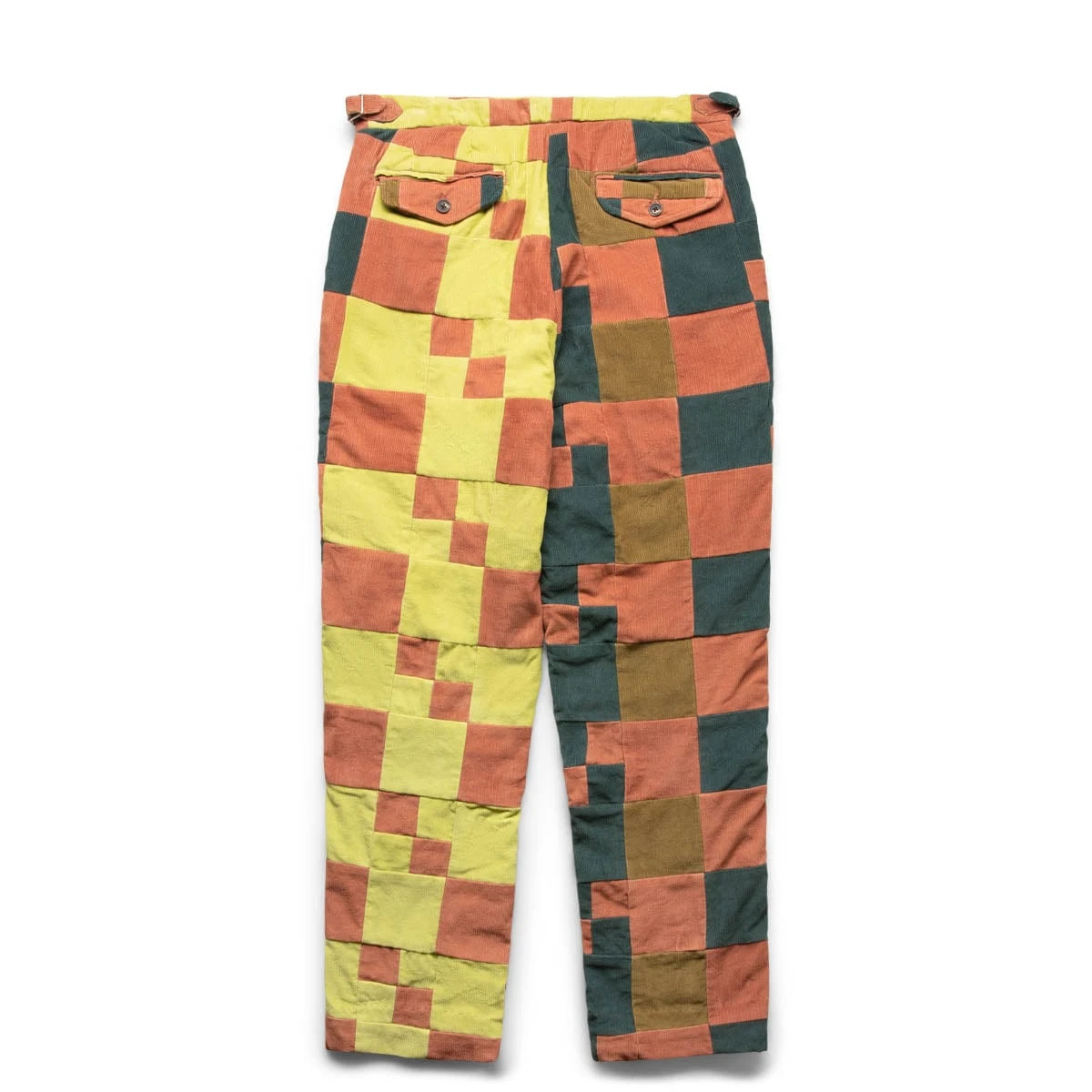These trousers are inspired by a 1970s patchwork quilt top. The square corduroy patchwork was faithfully reproduced with the original playful colors. The silhouette is that of a traditional trouser – high rise, straight leg.