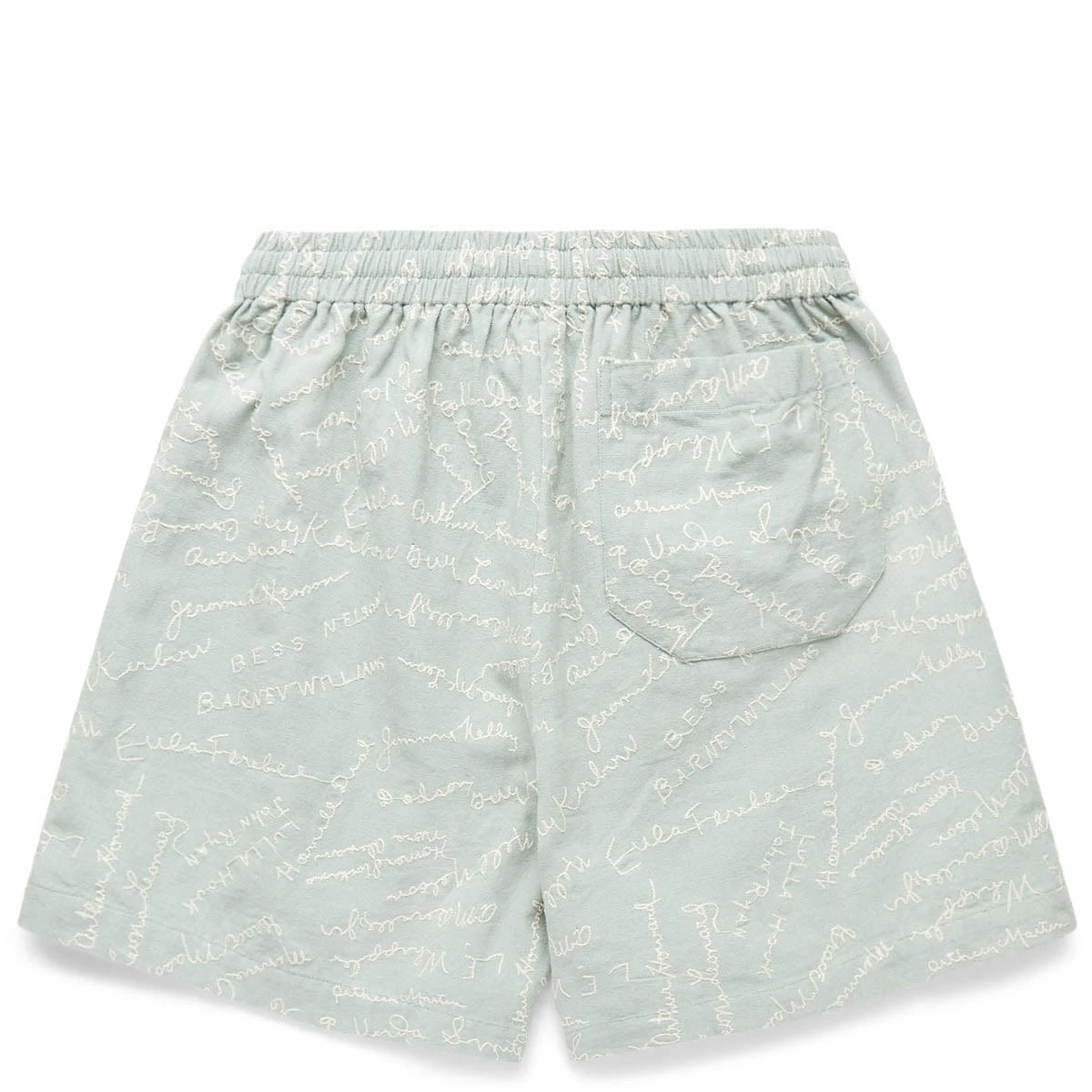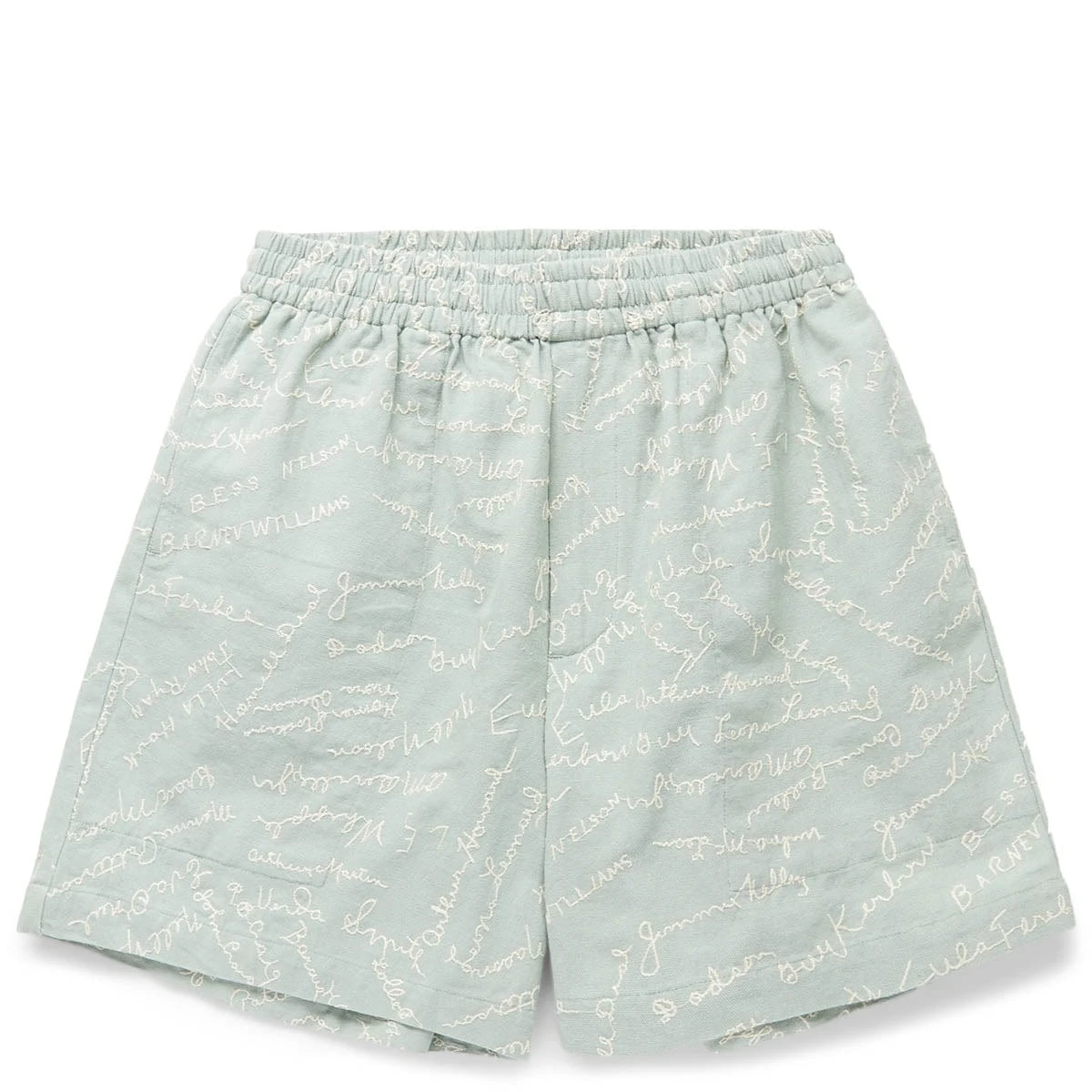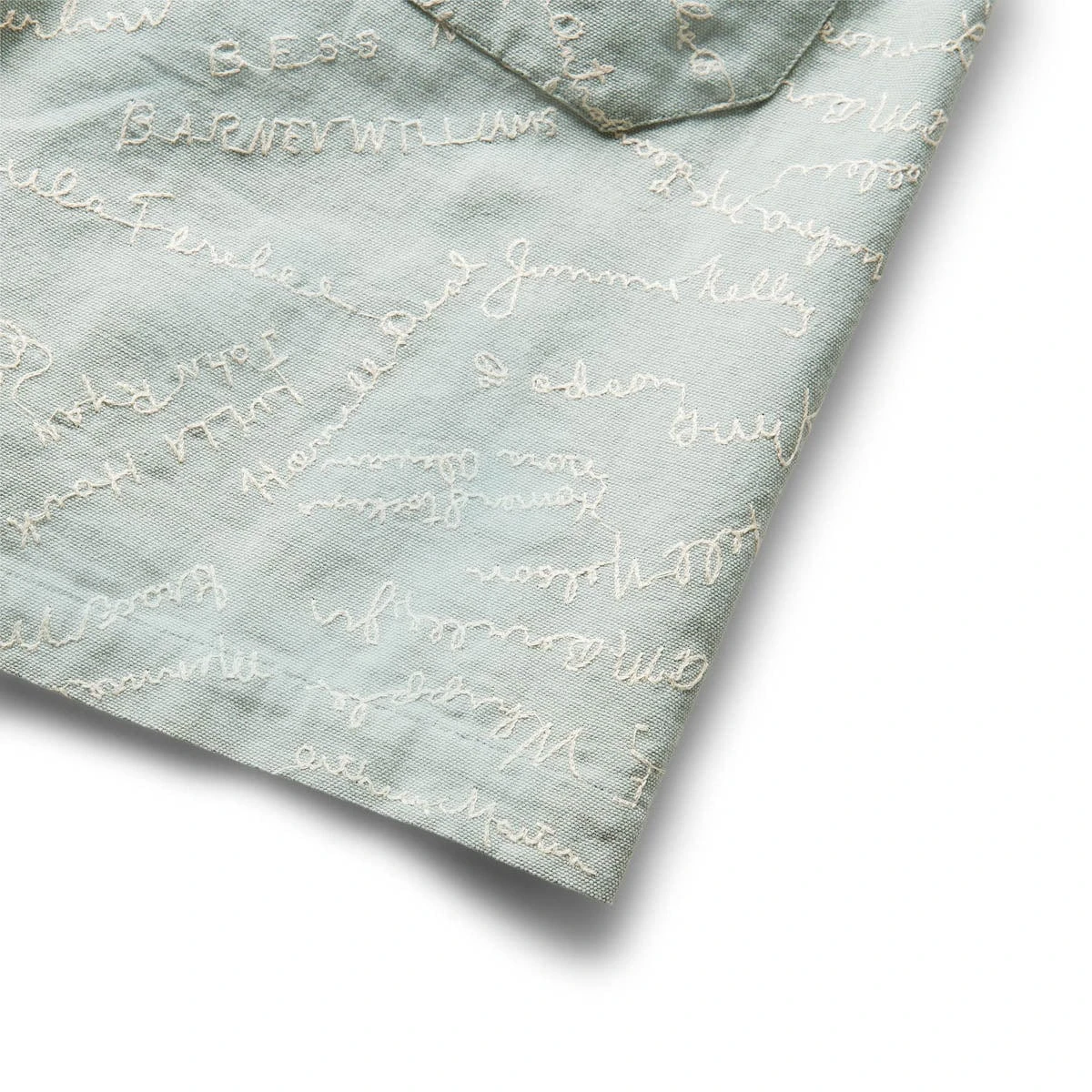 These shorts are inspired by a 1950s embroidered panel. The shorts feature a faithful reproduction of the all-over embroidery of various names. Groups of friends would often sign fabric which would then be embroidered and used for pillowcases or other mementos. The silhouette is that of a traditional trouser — high rise, straight leg. The shorts silhouette is reminiscent of traditional rugby shorts worn throughout Canada with a short inseam and wide leg opening.