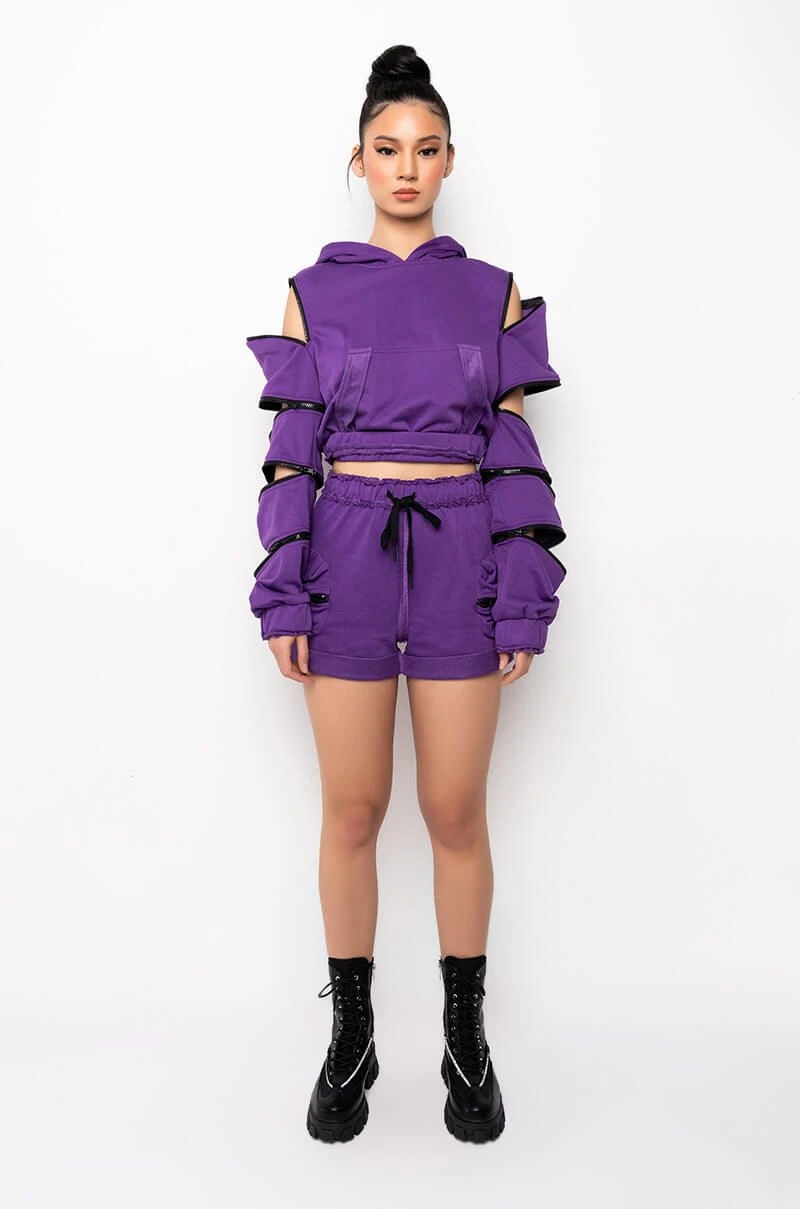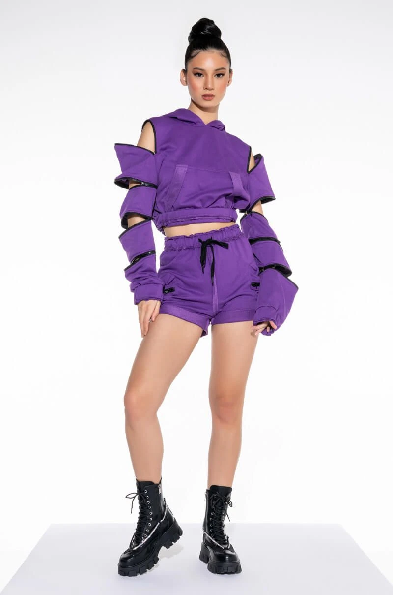 The AKIRA Bois Lie SweatShort features a sweatshirt-like cozy knit fabrication, a high rise drawstring elastic waistband, and dual zip front cargo pockets. Complete with raw detailing at the waist and cuffed hems. Pairs perfectly with the coordinating Bois Lie Sweatshirt.