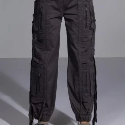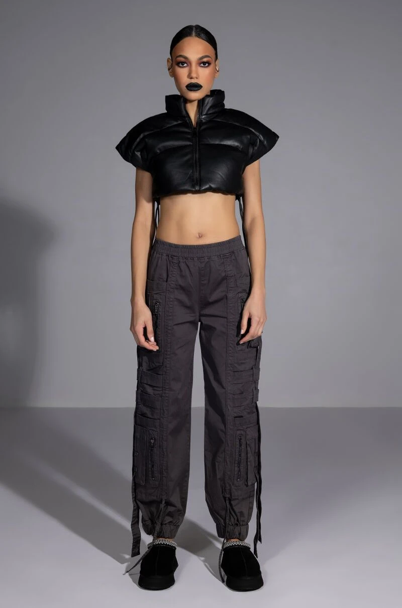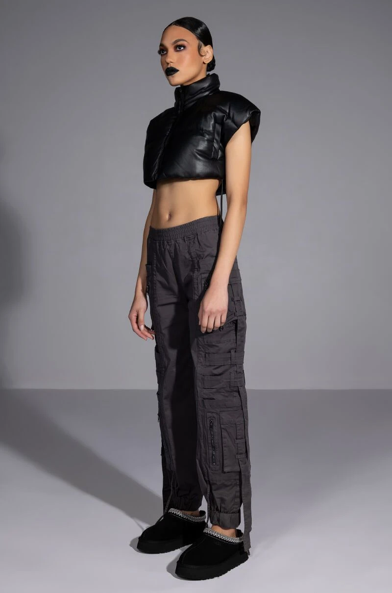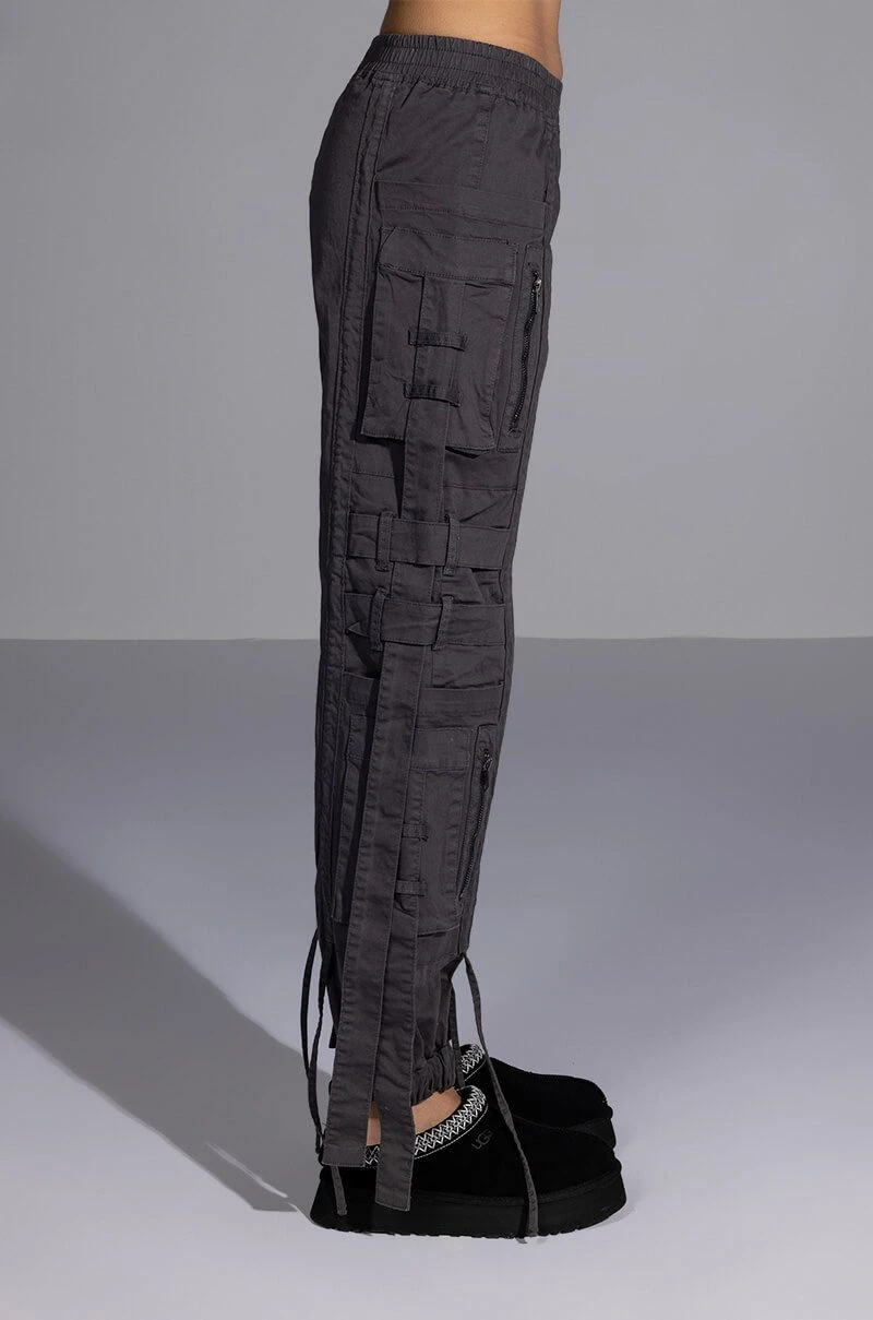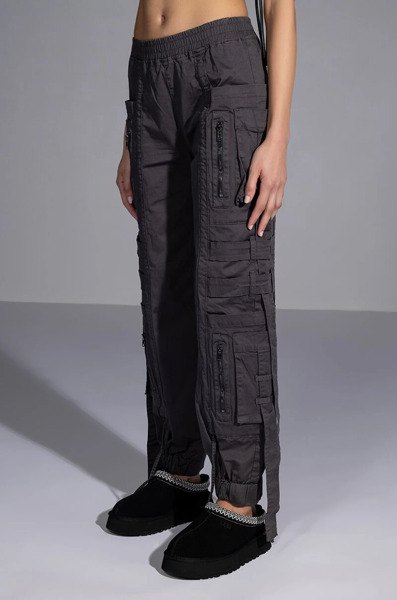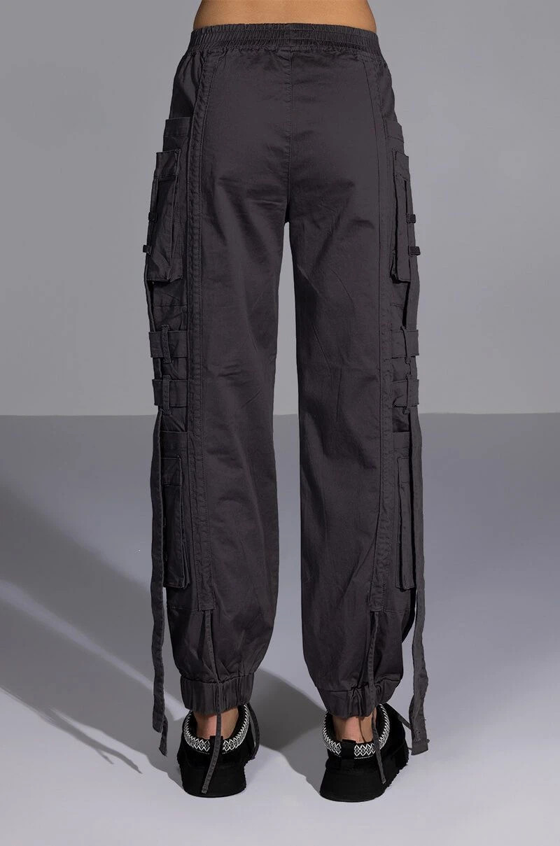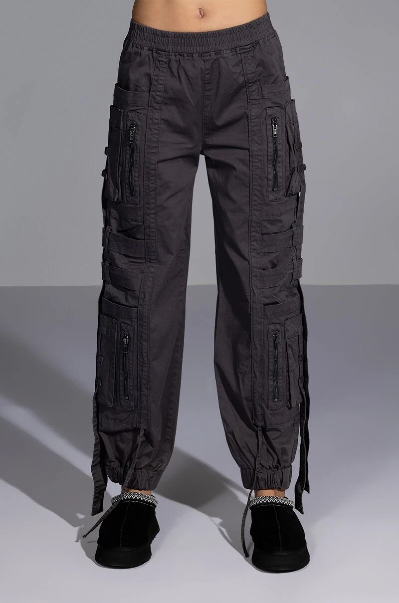 The AKIRA Label Can’t Sleep Cargo Pant is a fashionable take on the utilitarian trend featuring a high rise silhouette, a smocked elastic waistband, dual deep pockets on each leg, slim pockets cargo pockets, zip front faux pockets, belted strap detailing, and dangling strap accents. Complete with a baggy oversized silhouette, cinched ankle hems, and a pull on fit. Pair this piece with a cropped sweater and chunky sneakers to finish off your amped-up casual look.