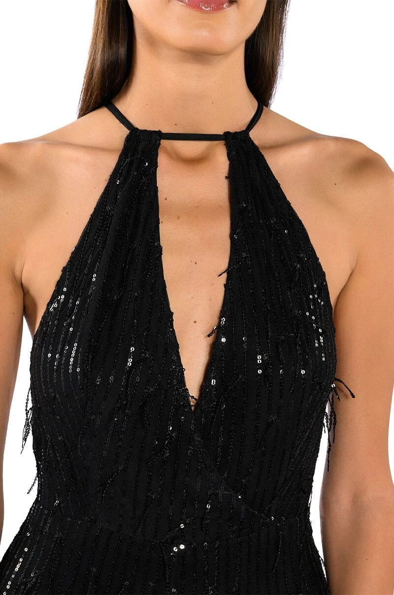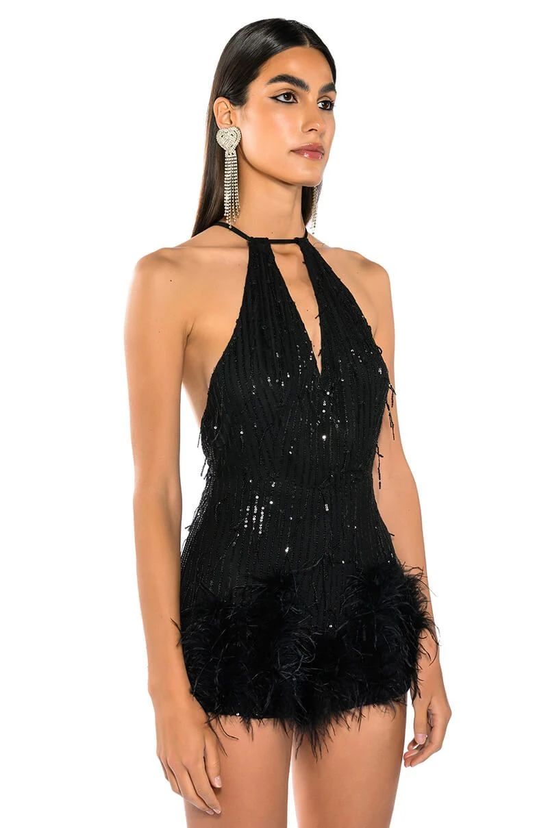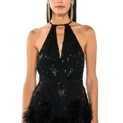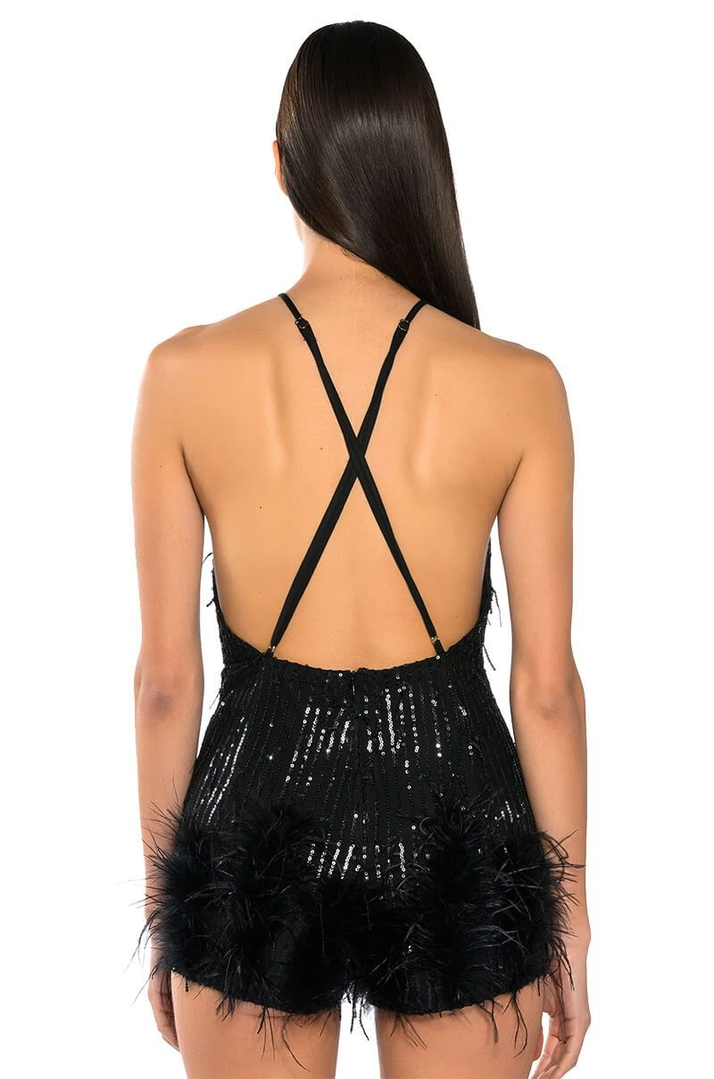 The AKIRA Label Cat’s Meow Sequin Fringe Feather Trim Romper is made from a layered mesh fabrication and features sequin fringe body detailing, adjustable cross-back spaghetti straps, a plunging wrap front neckline, slick lining, attached shorts with opulent feather trim, and a tonal back zipper closure.