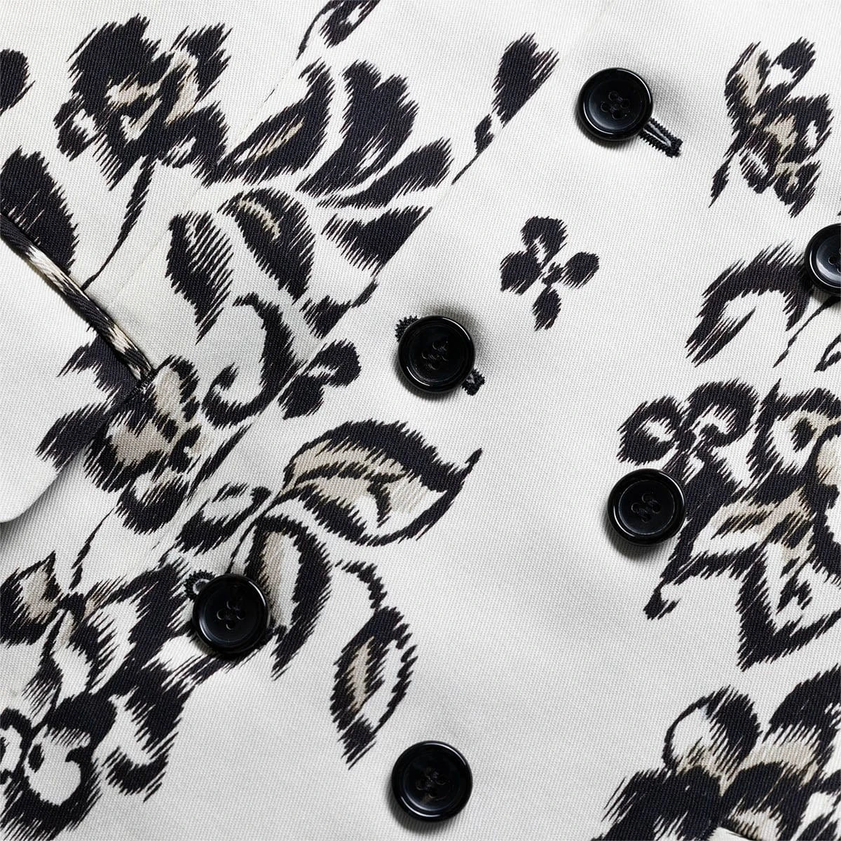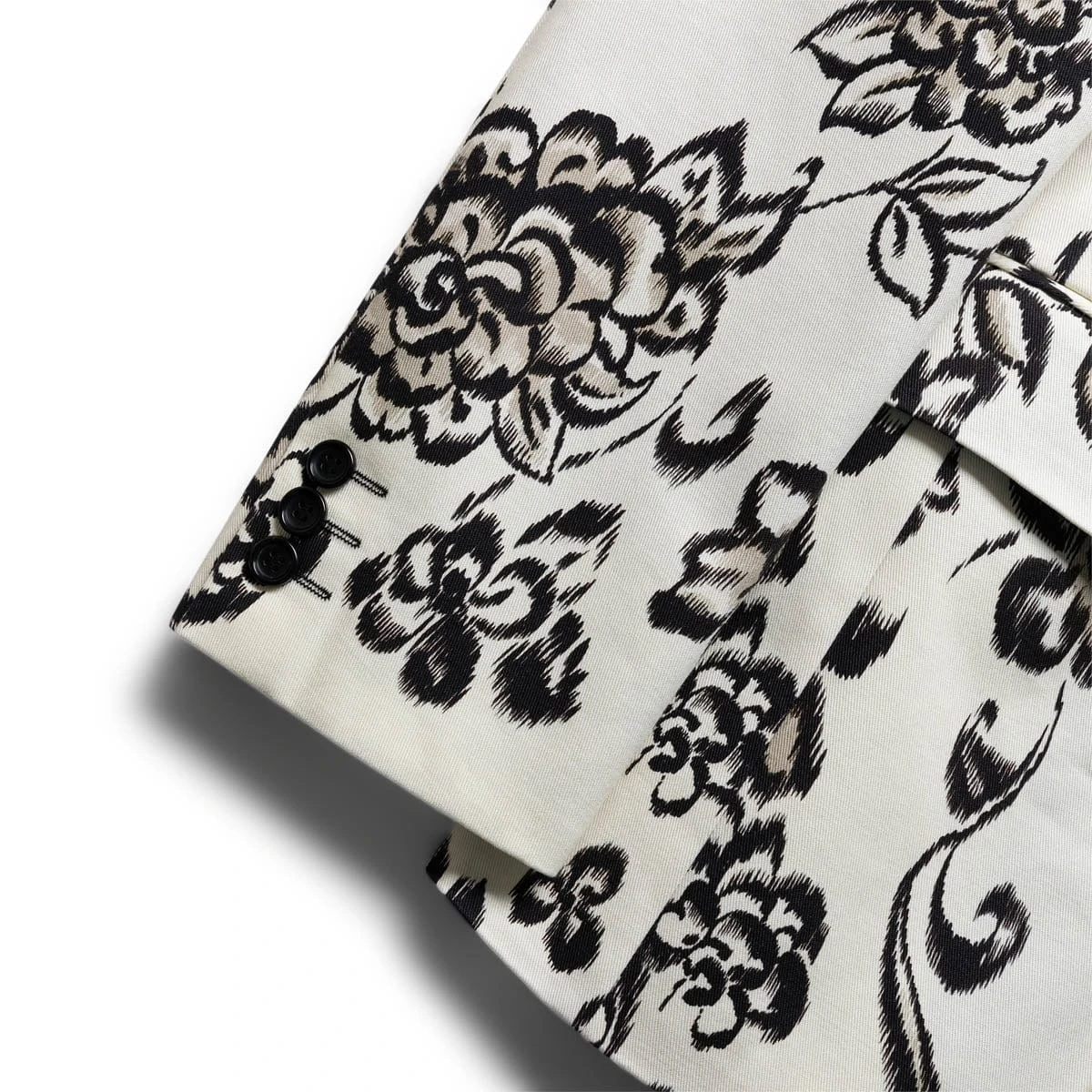 - Double breasted, peak lapels, padded shoulders, long sleeves, buttoned cuffs, one welt pocket at chest, all-over floral pattern, two flap pockets at sides, double vent, partially lined