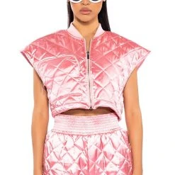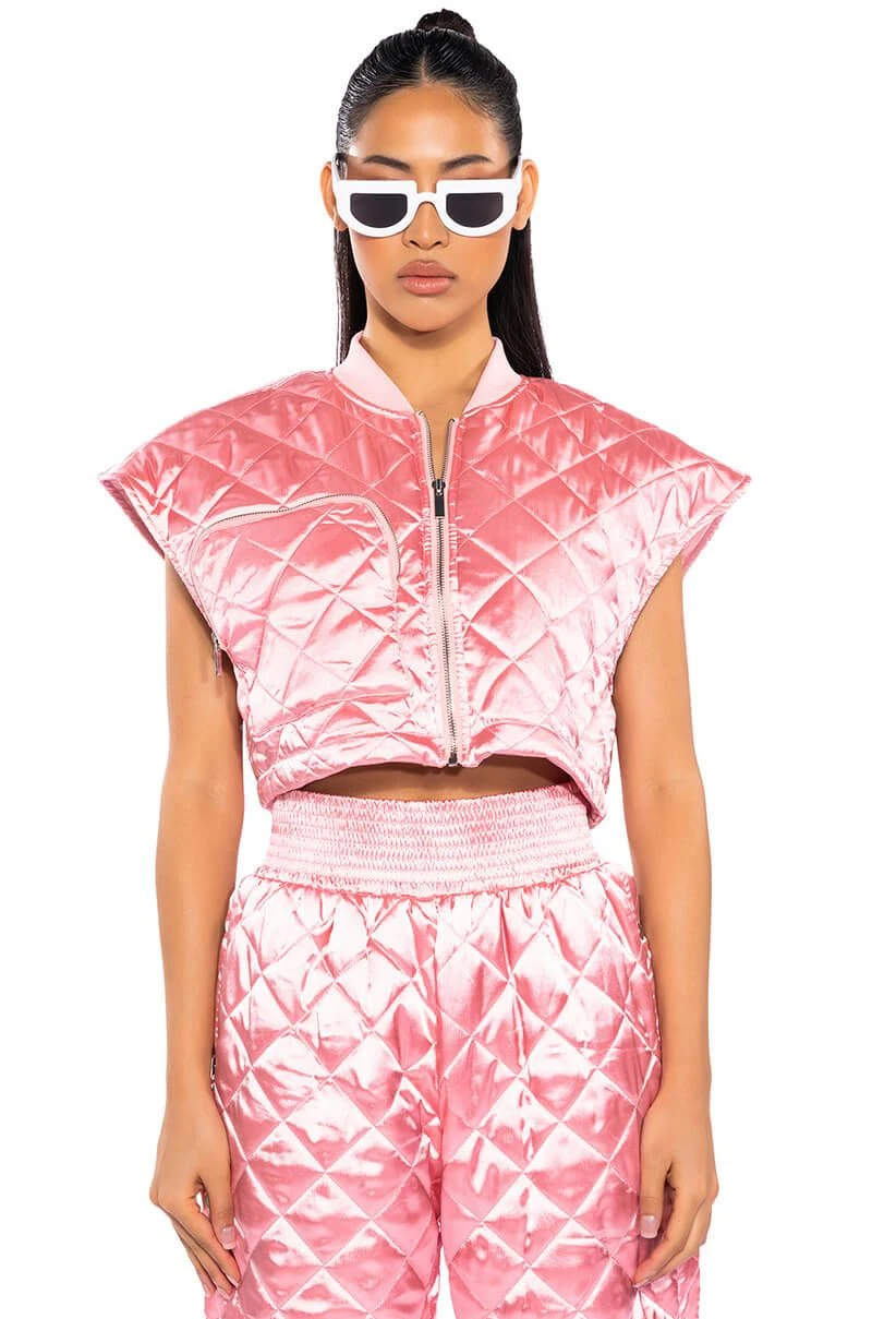 The AKIRA Label Cozy Mode Quilted Satin Vest in Pink is a cropped layering piece featuring a quilted satin base, a classic sleeveless cut, zip front pockets, and a ribbed knit standing collar. Complete with a smooth inner lining, silver hardware, and a front zipper closure. Pair with the coordinating AKIRA Label Cozy Mode Quilted Satin Breakaway Jogger in Pink for a fresh fit.