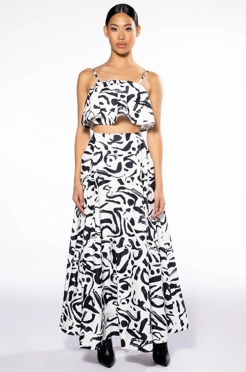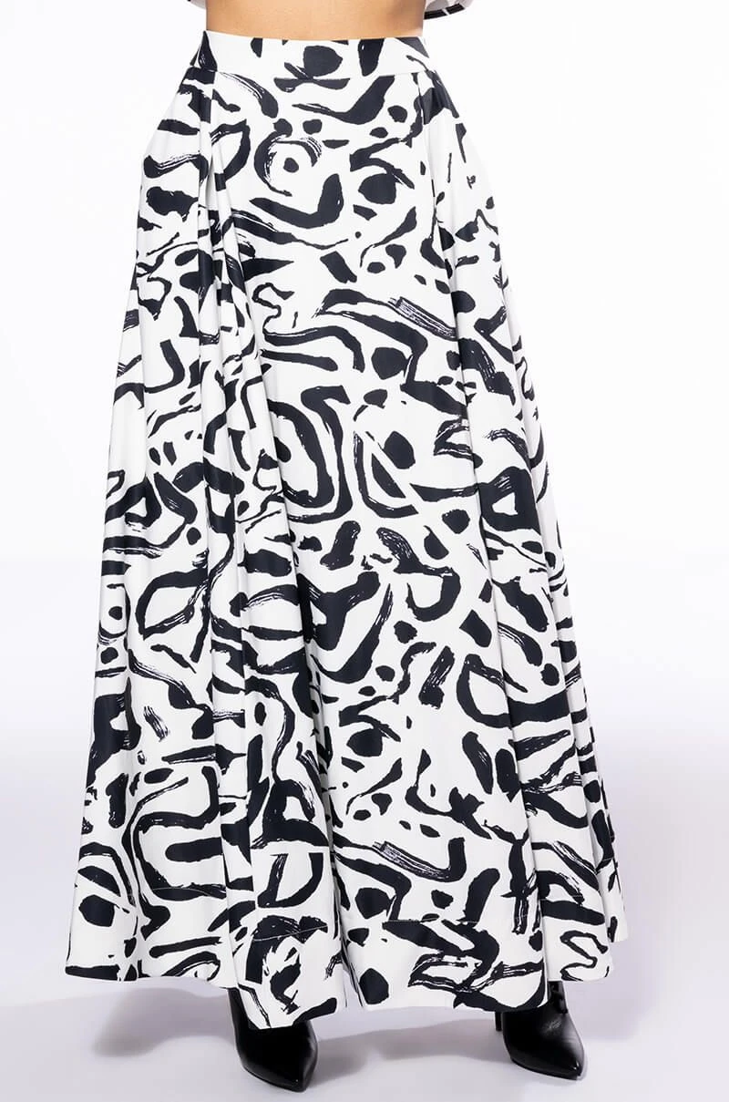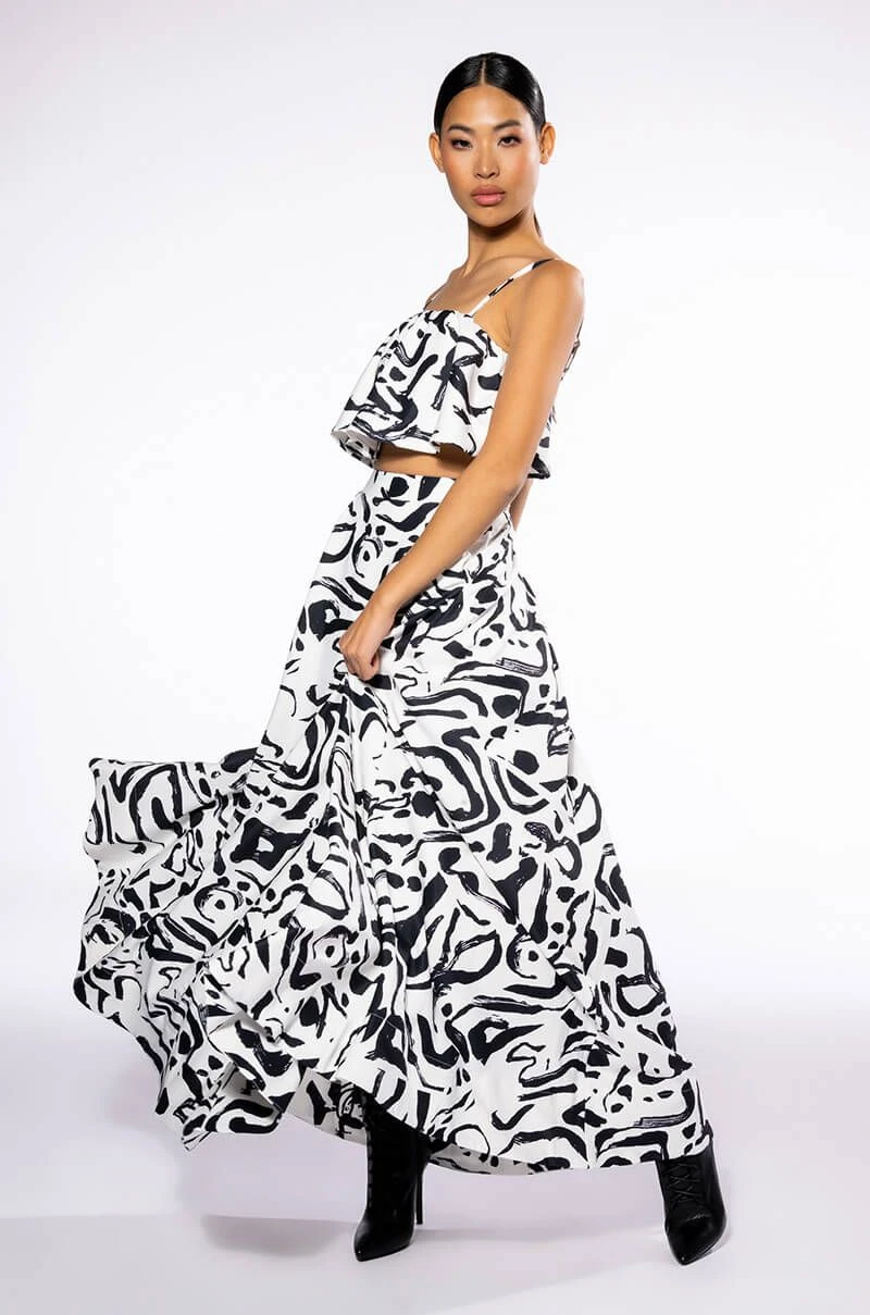 The AKIRA Label Dali’s Muse Abstract Maxi Skirt is a sophisticated skirt complete with a smooth fabrication, graphic digital brushstroke print patterning, slant side pockets, pleat front detailing, and a flowing maxi length. Complete with a satin inner lining and a concealed back zipper closure. Pair with the coordinating AKIRA Label Dali’s Muse Bandeau Abstract Top to complete the look.