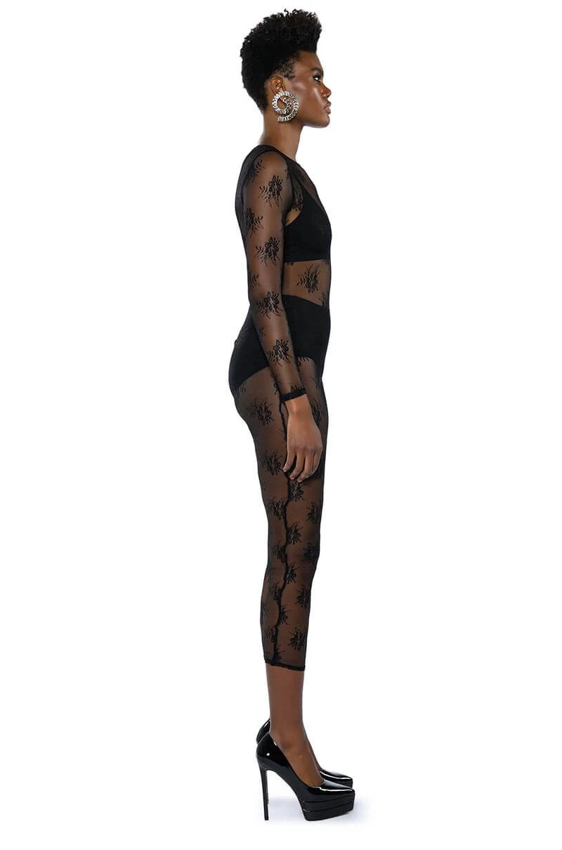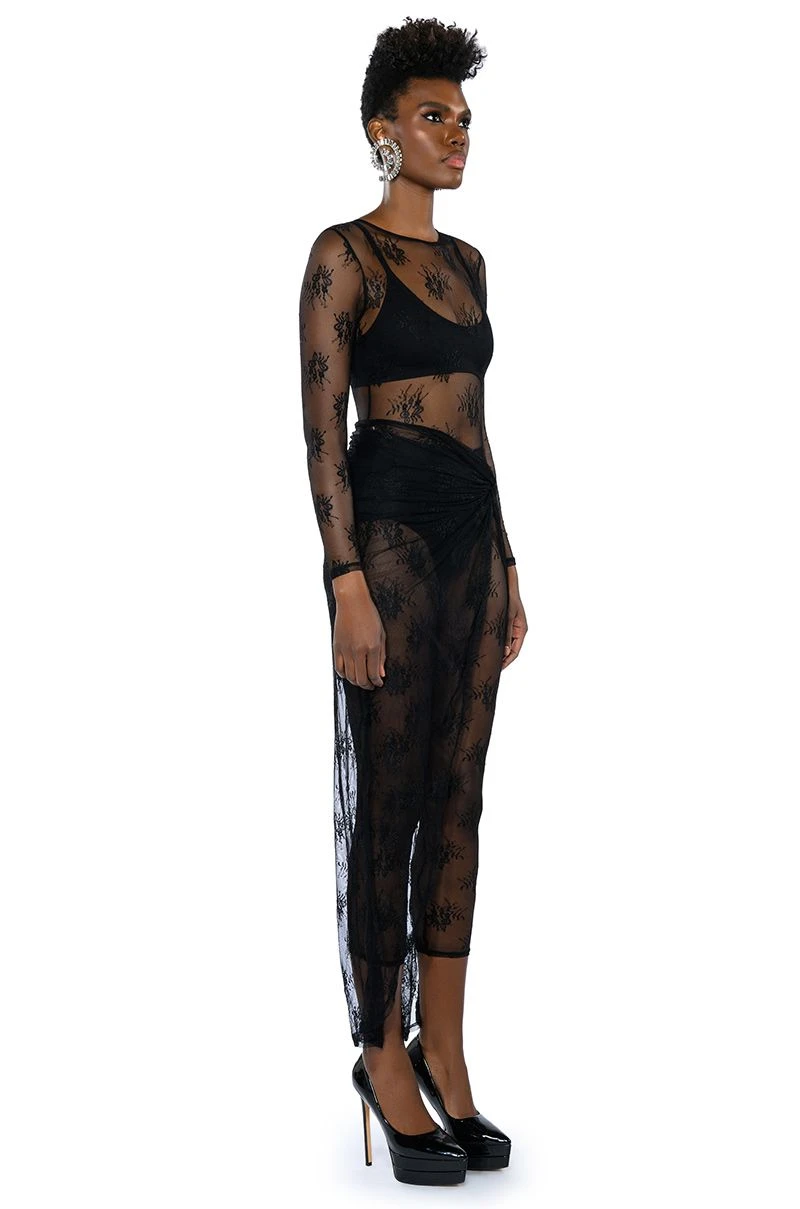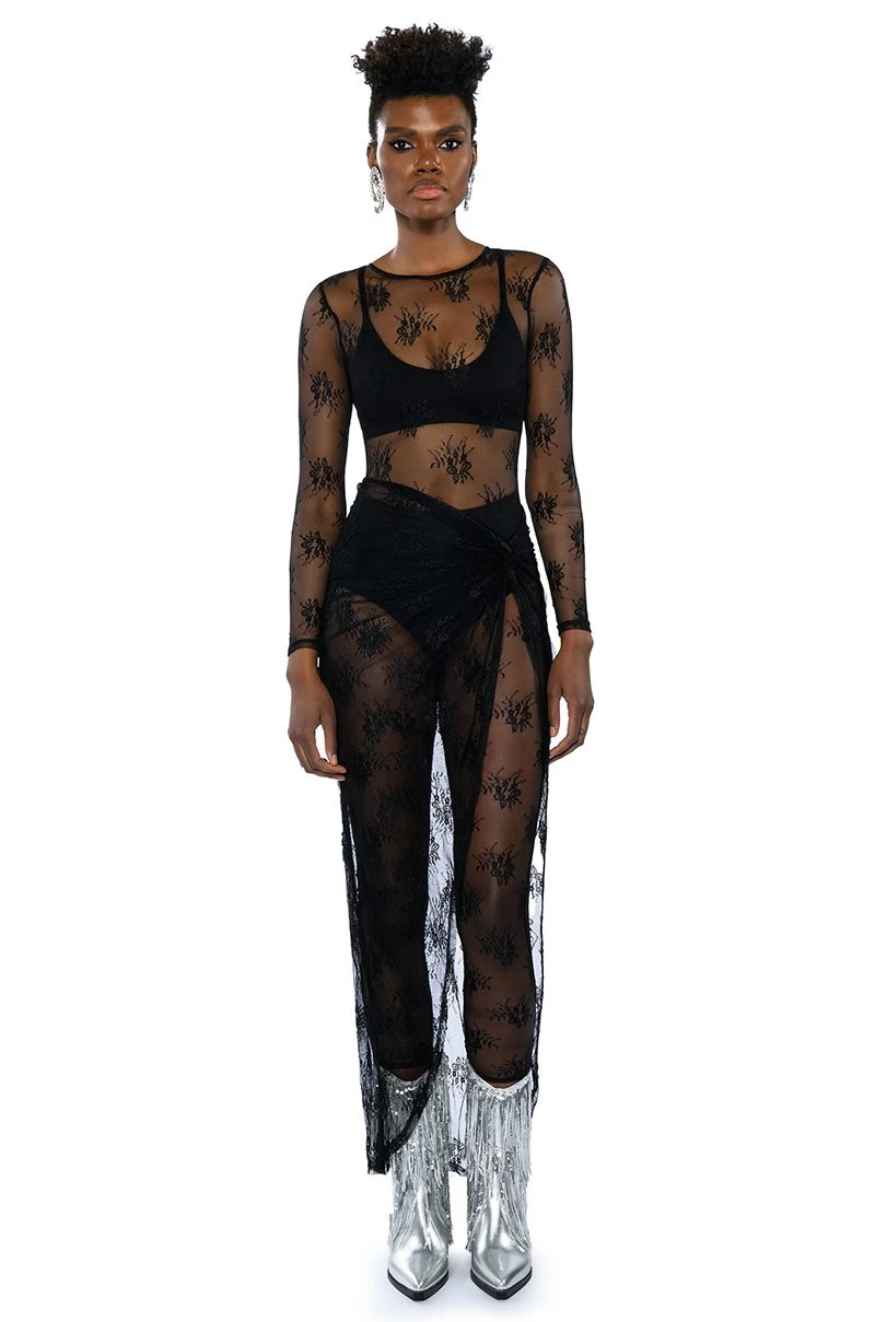 The AKIRA Label Day By Day Lace Jumpsuit And Twist Front Maxi Skirt Set is made from a sheer floral lace fabrication and features: a jumpsuit with a high, rounded neckline, long sleeves, a skinny leg fit, and a tonal back zipper closure. Also included is a coordinating lace skirt with a twist front waist detail, a sexy front slit, a maxi length silhouette, and a pull-on fit to layer over the jumpsuit with ease. Shown undergarments not included.
