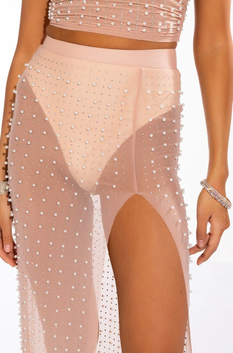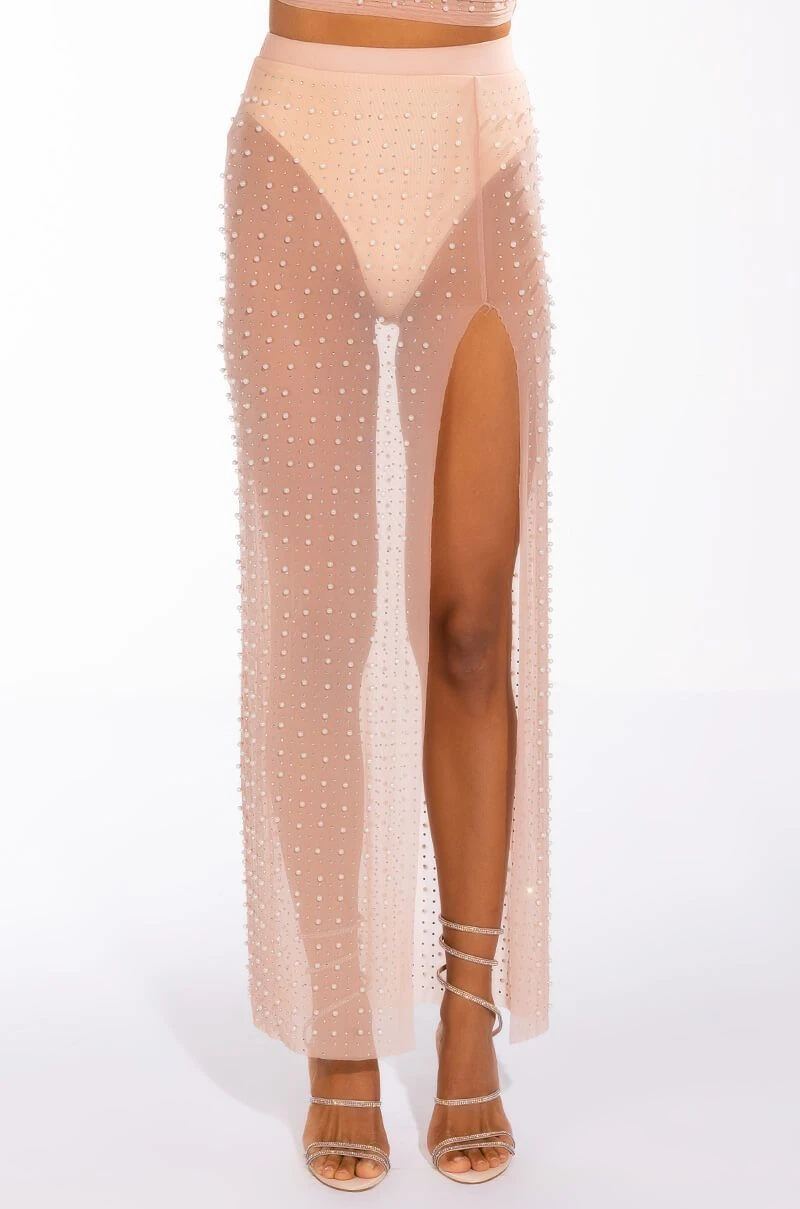 The AKIRA Label Disco Doll Embellished High Slit Mesh Maxi Skirt is made from a sheer mesh fabrication and features a high rise waist with a wide elastic waistband, a maxi length silhouette, a sexy high side slit, and cheeky inner panties with a gusset closure. Pair this glimmering piece with the coordinating AKIRA Label Disco Doll Embellished One Shoulder Mesh Crop Top to finish off your dance floor-worthy look!