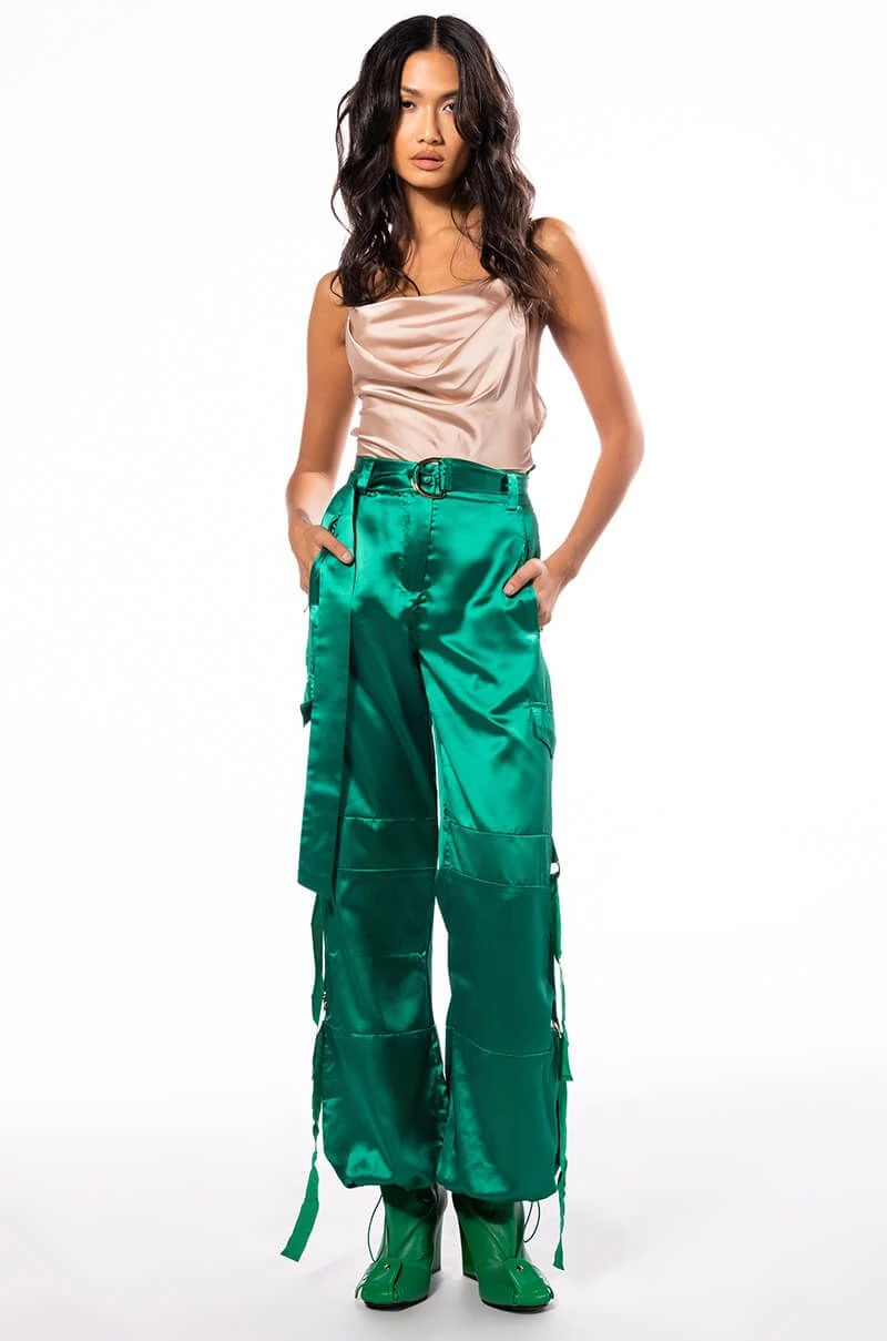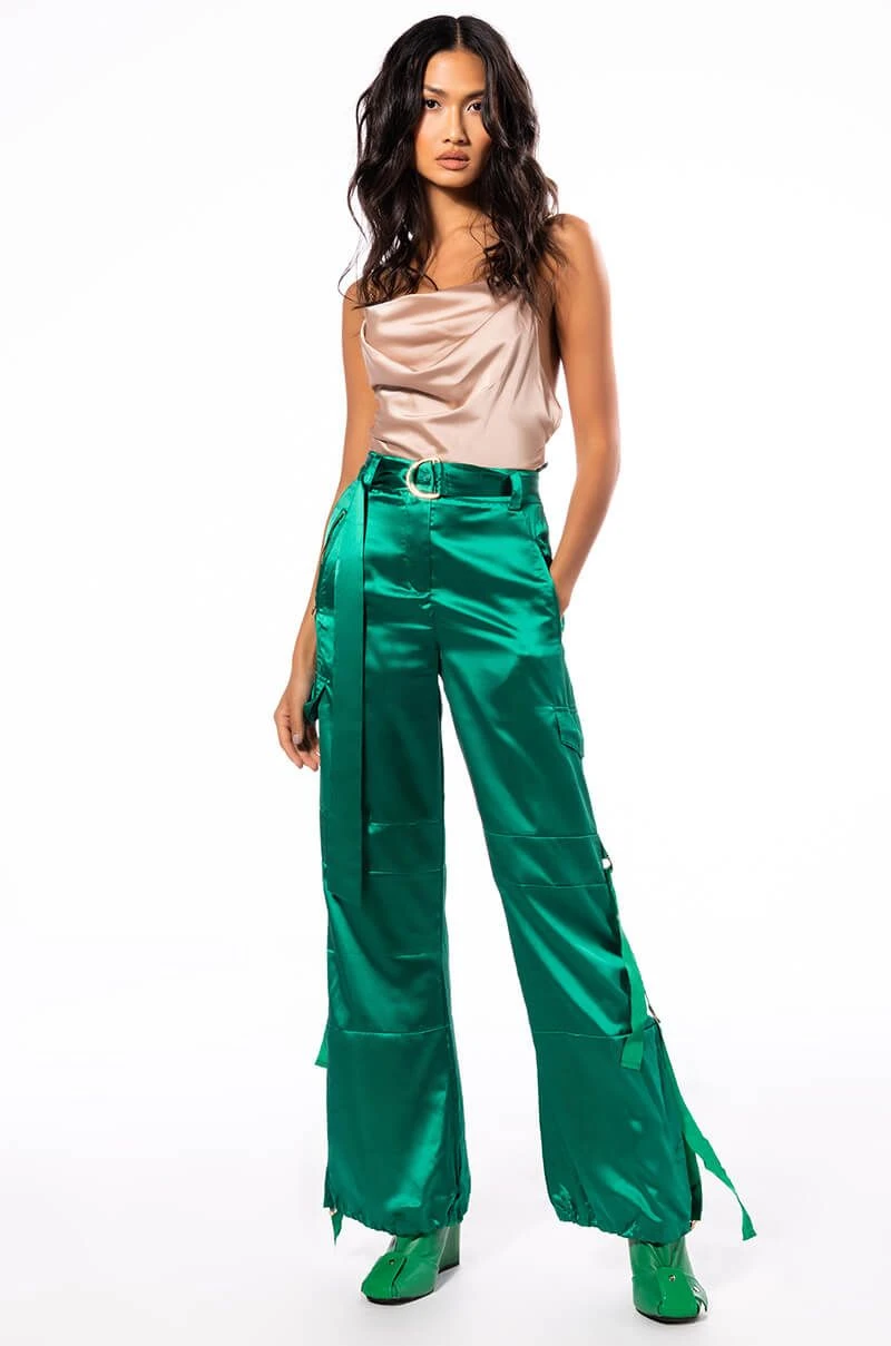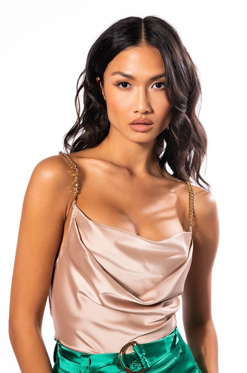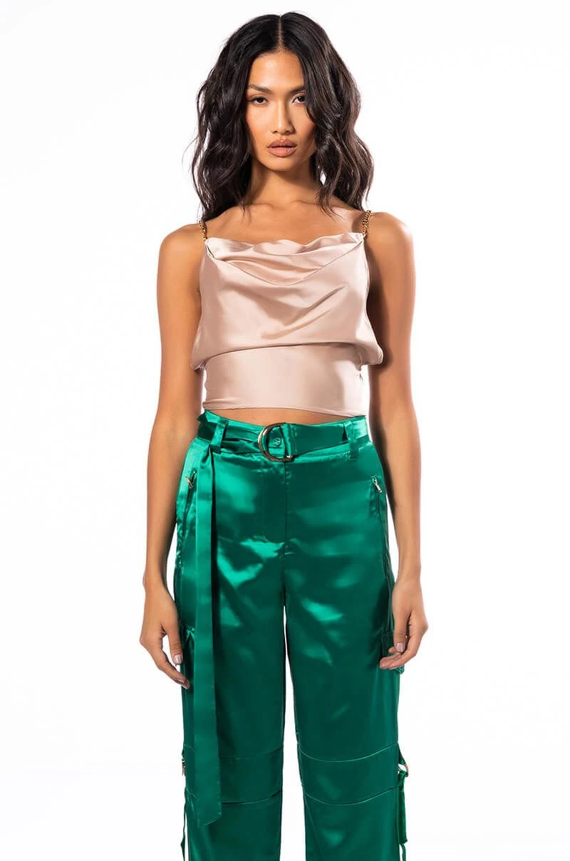 The AKIRA Label Diva Drip Sleeveless Chain Detail Satin Cowl Neck Blouse is made from a slick satin fabrication and features a cowl neckline, detachable racerback curb chain link straps with ring detail, and a cropped silhouette. Complete with an exposed back zipper closure.