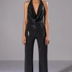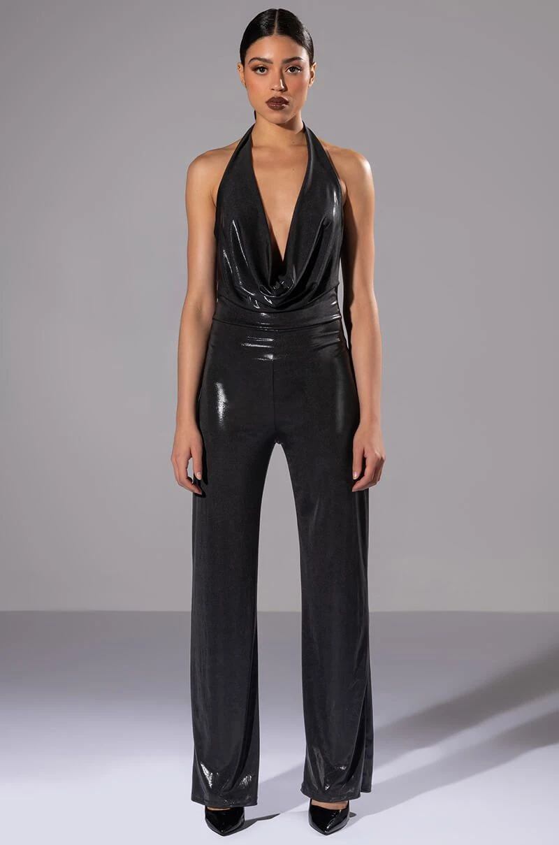 The AKIRA Label Do Better Metallic Cowl Neck Jumpsuit is made from a lightweight, stretchy fabrication and features an iridescent cowl neckline, halter design, straight pant legs, an open back with adjustable halter neck band, and a slip-on fit. Pair this piece with a cropped fur coat for a luxe look!