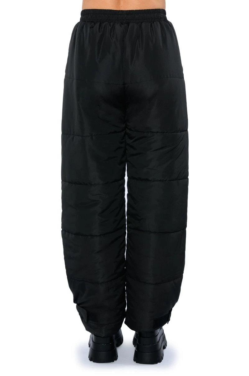 The AKIRA Label Double Up Puffer Pull On Jogger is made from a slick fabrication and features a high rise waist, a ruched elastic waistband with toggle drawstring detail, slant side pockets, wide puffer pant legs, and velcro ankle hems. Pair this piece with a mock neck sweater and furry booties to complete your cozy cute look.