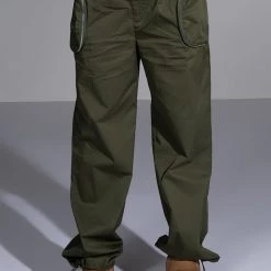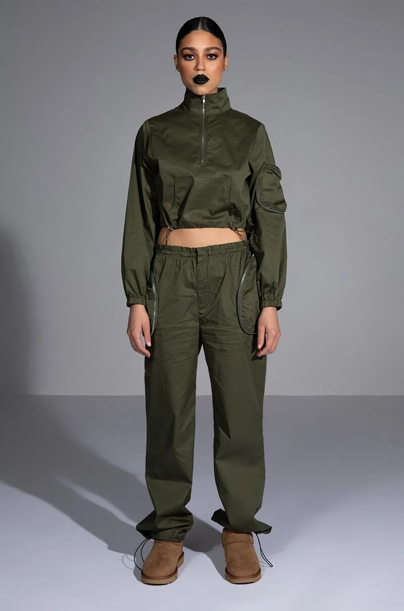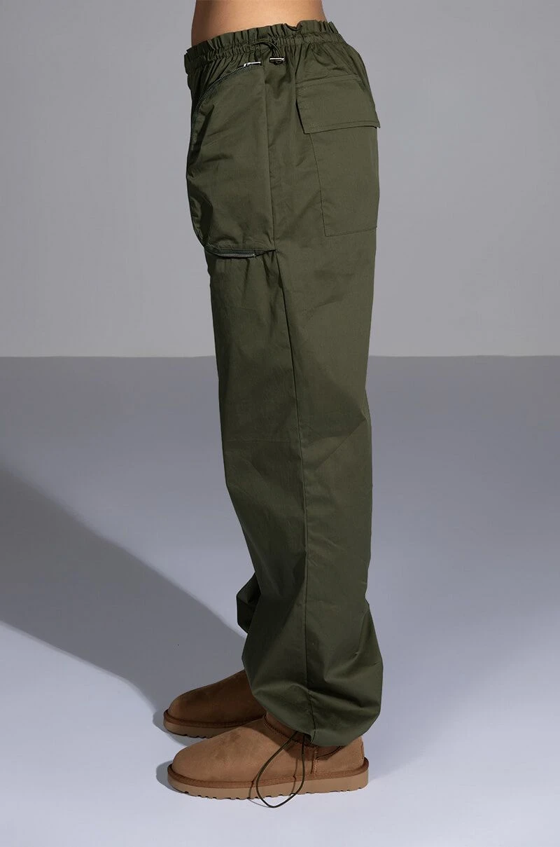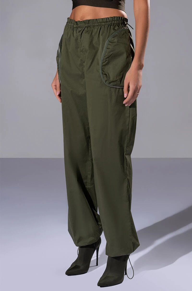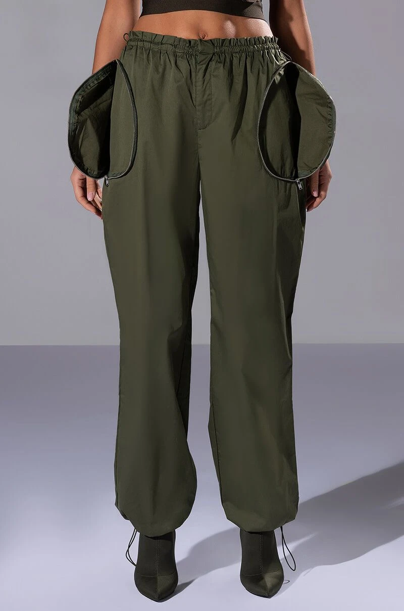 The AKIRA Label Dylan Parachute Cargo Jogger is made from a slick, lightweight windbreaker fabrication and features a high rise toggle drawstring paperbag waist, zippered cargo front pockets, a relaxed fit, a flap back pocket, and toggle drawstring ankle hems. Complete with a front snap button and zipper closure. Pair this piece with the coordinating AKIRA Label Dylan Cropped Windbreaker to complete your look!
