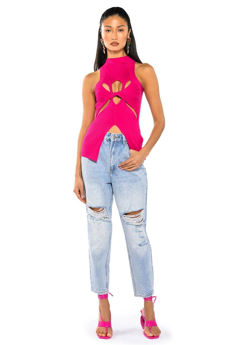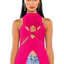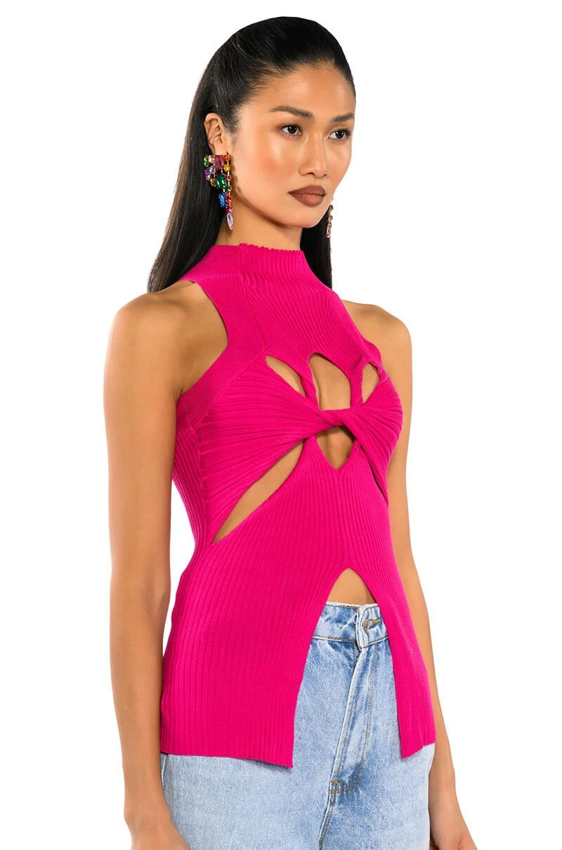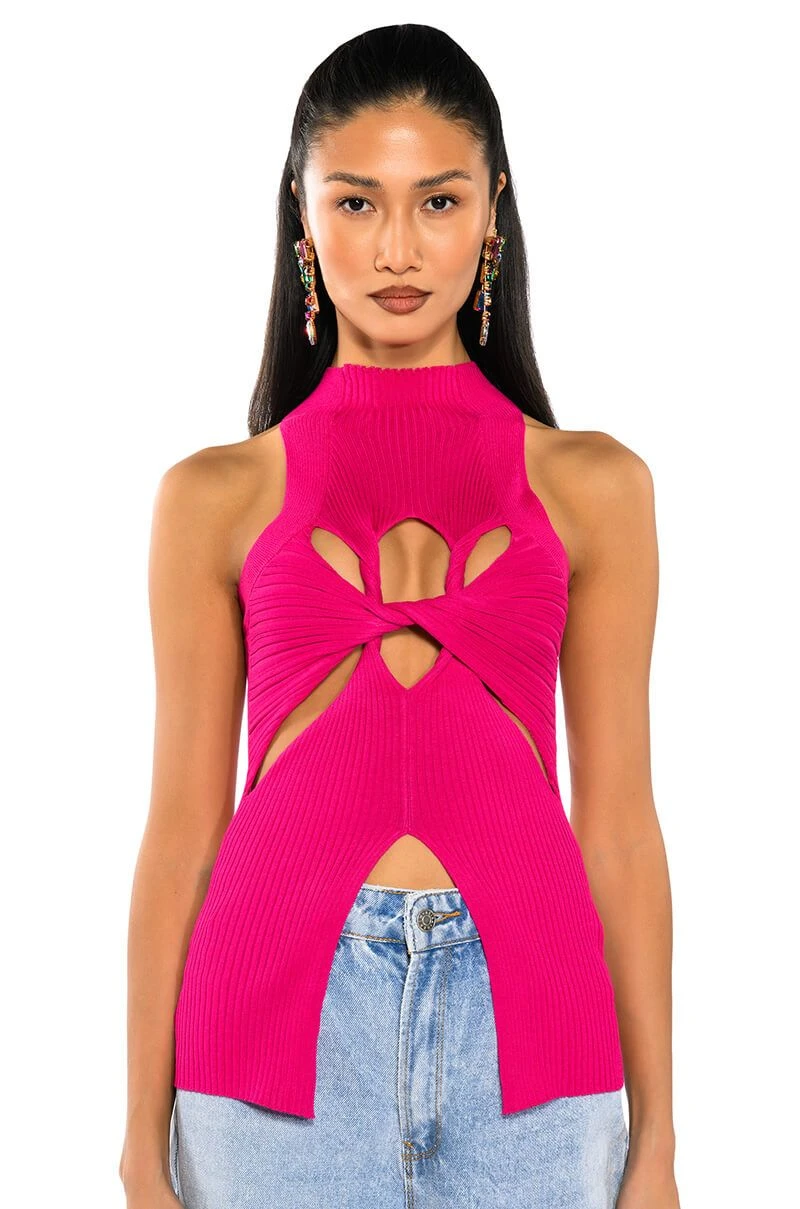 The AKIRA Label Dynamite Mock Neck Twist Detail Sleeveless Knit Top is made from a stretch knit base fabrication, and features a mock neck, a sleeveless silhouette, and a layered twisted front design. Complete with cutouts at the front chest and sides, as well as front bottom hem. Pair with relaxed cargos and chunky heeled boots for an off-duty look.