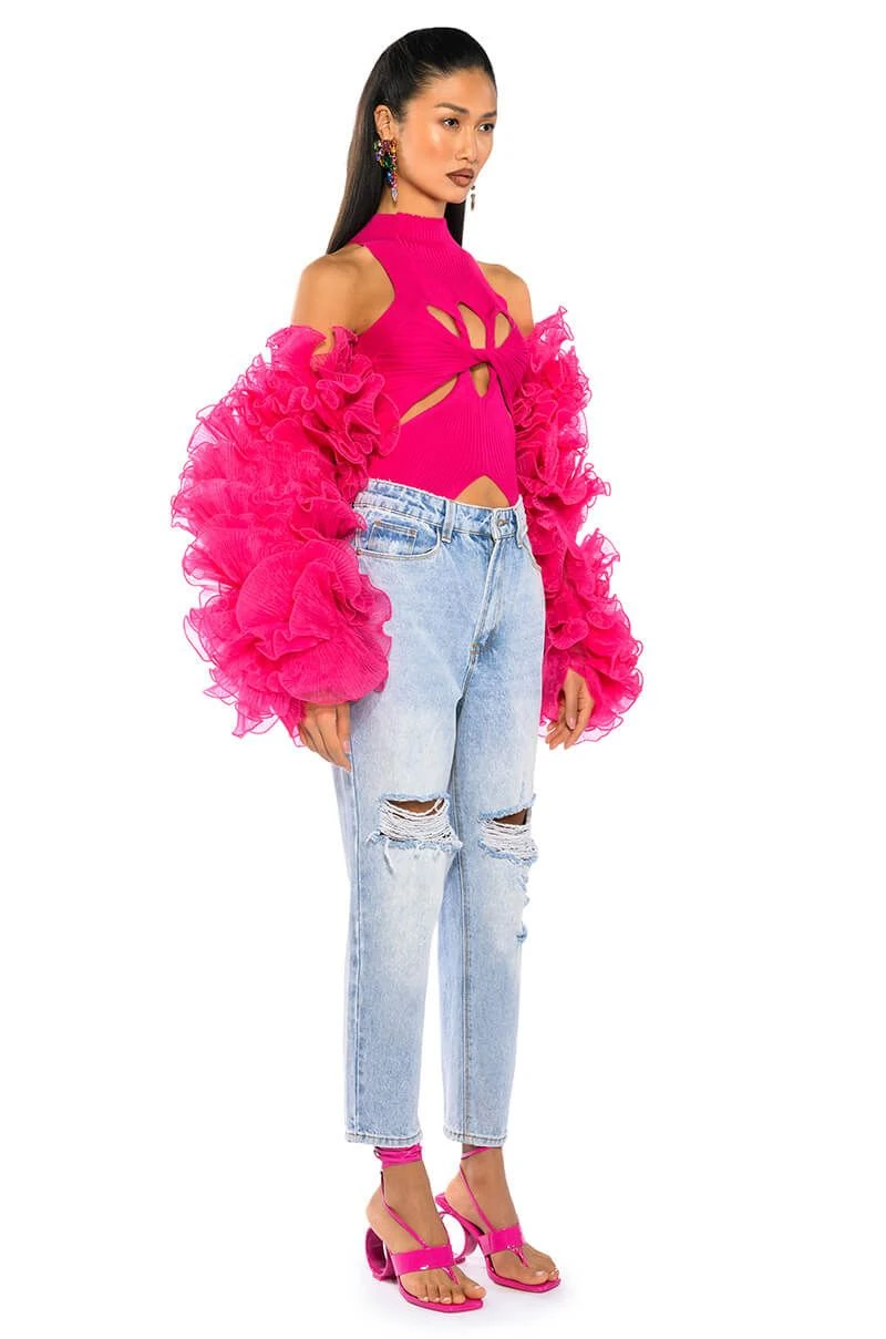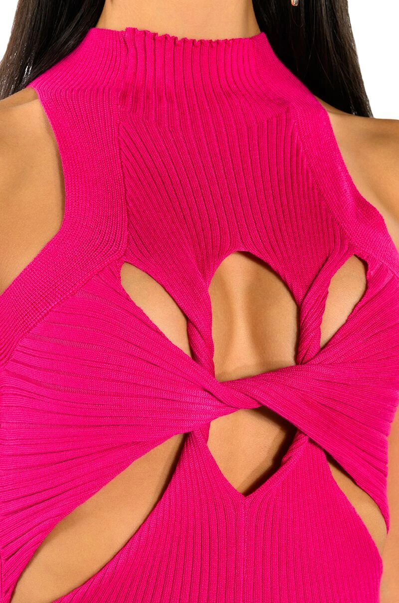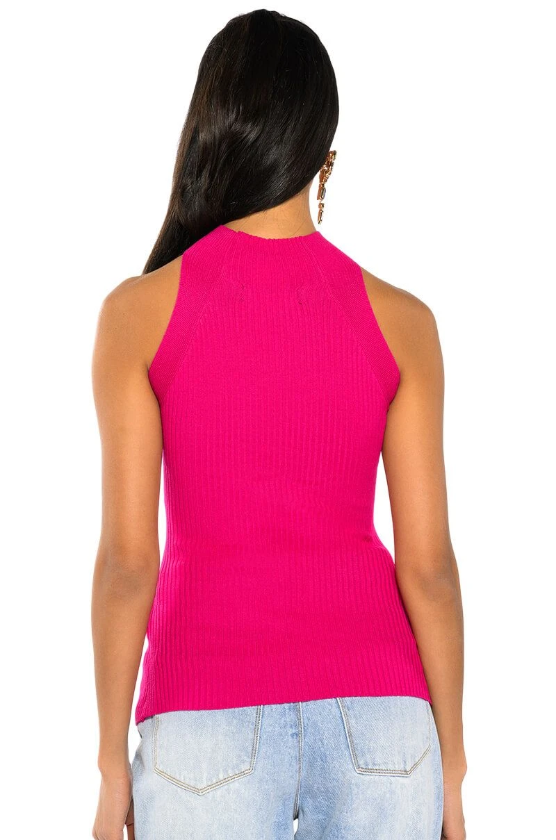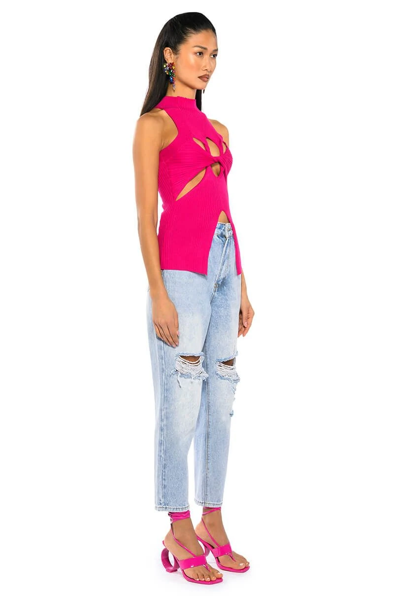The AKIRA Label Dynamite Mock Neck Twist Detail Sleeveless Knit Top is made from a stretch knit base fabrication, and features a mock neck, a sleeveless silhouette, and a layered twisted front design. Complete with cutouts at the front chest and sides, as well as front bottom hem. Pair with relaxed cargos and chunky heeled boots for an off-duty look.