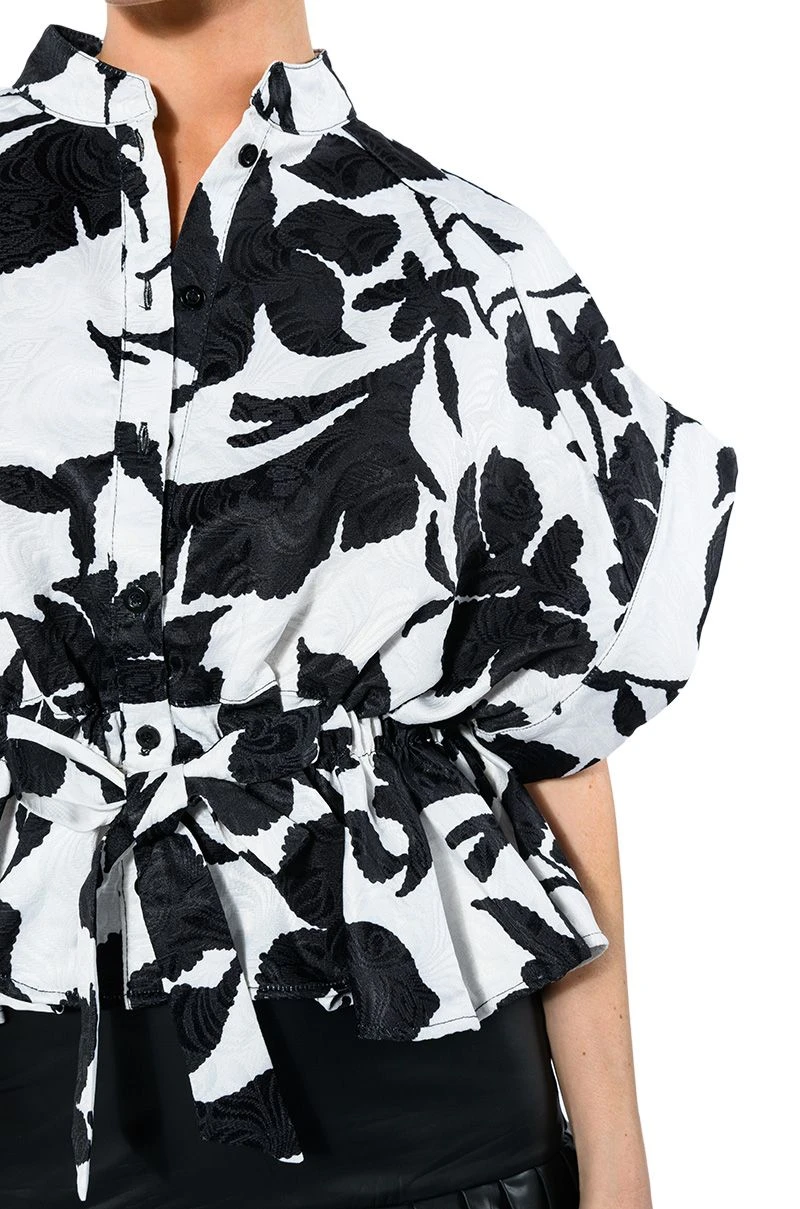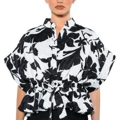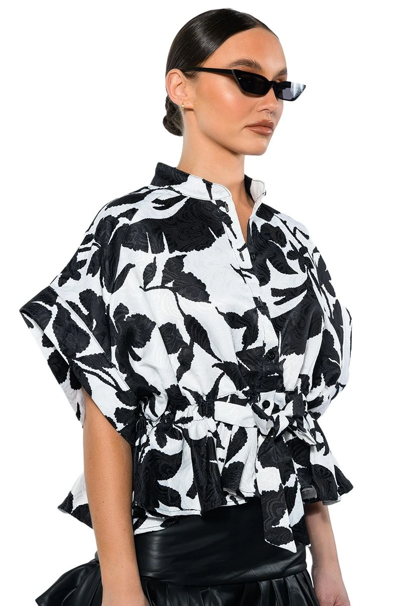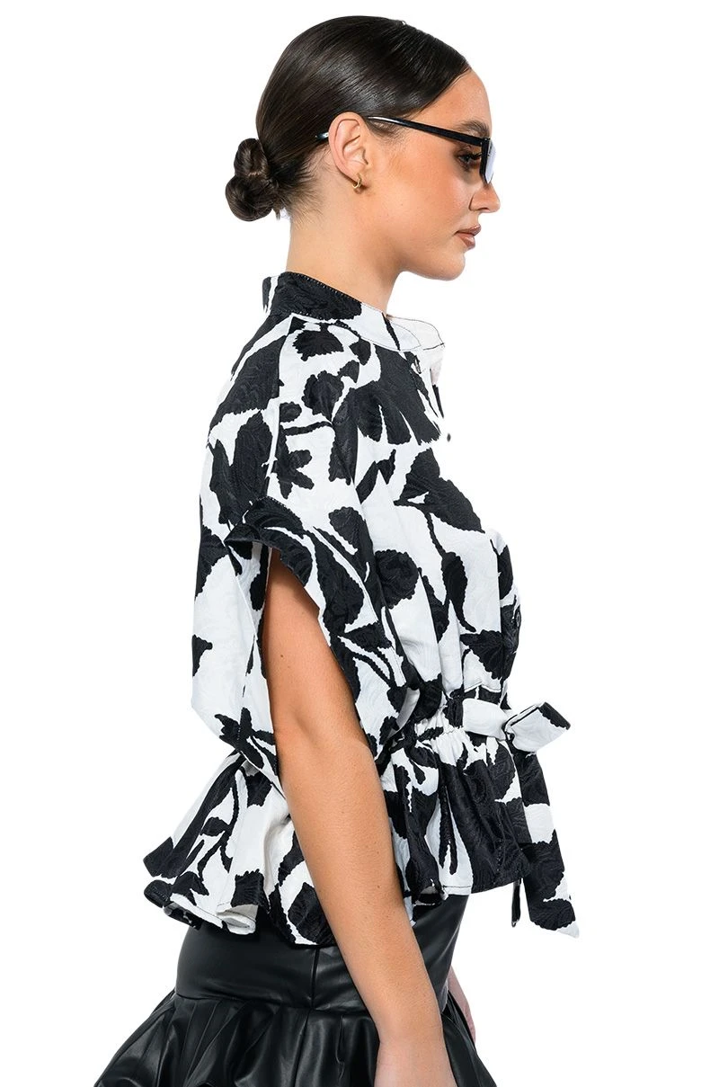 The AKIRA Label Eleganza Tie Front Blouse features a floral brocade base, a Mandarin collar, short cap sleeves, and a button down front closure. Complete with a tie front waistline and a cropped, peplum hem. Pairs perfectly with a cute trench, high waisted denim and knee high boots.