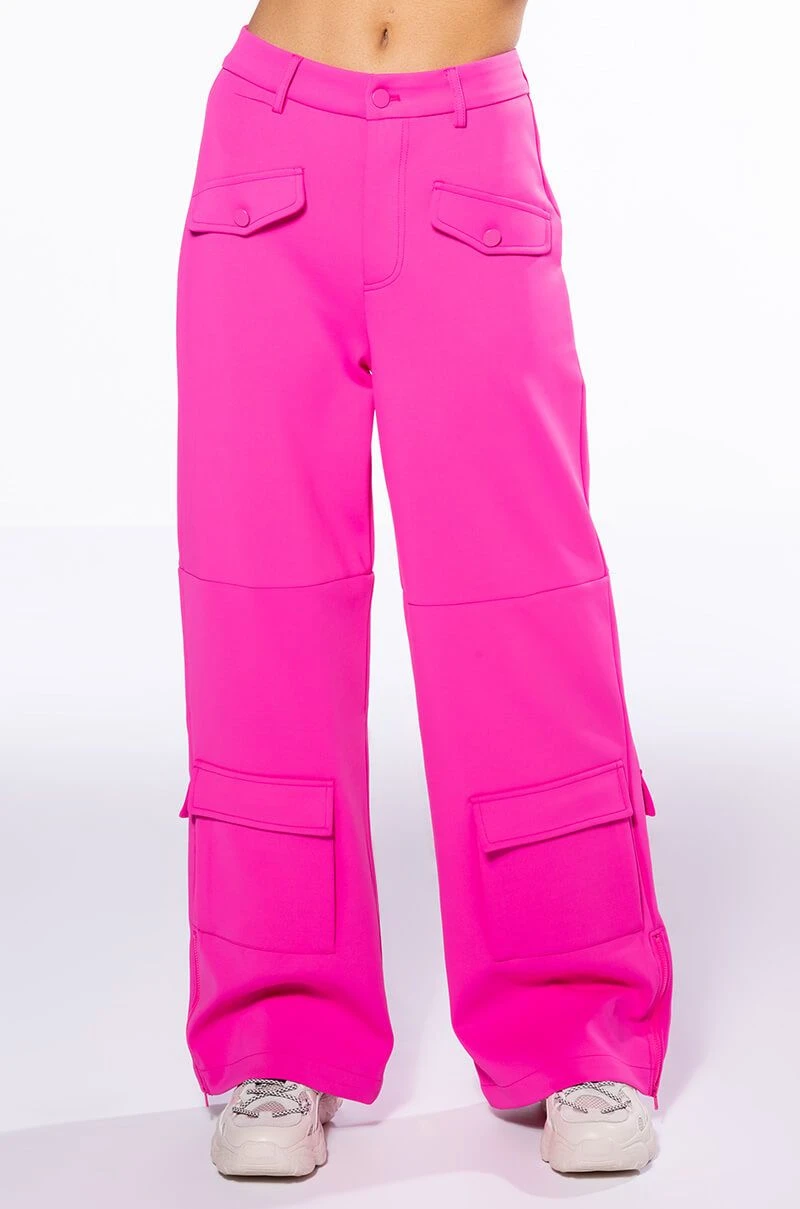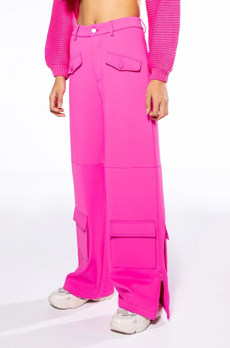 The AKIRA Label Elevated Cargo Pants In Pink are an elegant take on the cargo pant trend featuring a soft scuba knit base, a high rise waist, functioning belt loops, faux button front slant side pockets, flap front cargo back pockets, and coordinating flap front ankle cargo pockets at the front and back. Complete with a wide leg silhouette, zippered side slit hem detailing, and a zip button front closure.