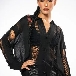 The AKIRA Label Emerson Shredded Knit Button Down is made from a soft knit fabrication and features shredded body paneling, a pointed collar, long sleeves with buttoned cuffs, a loose fit, and a button down front closure.