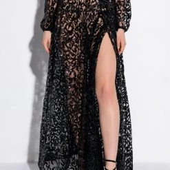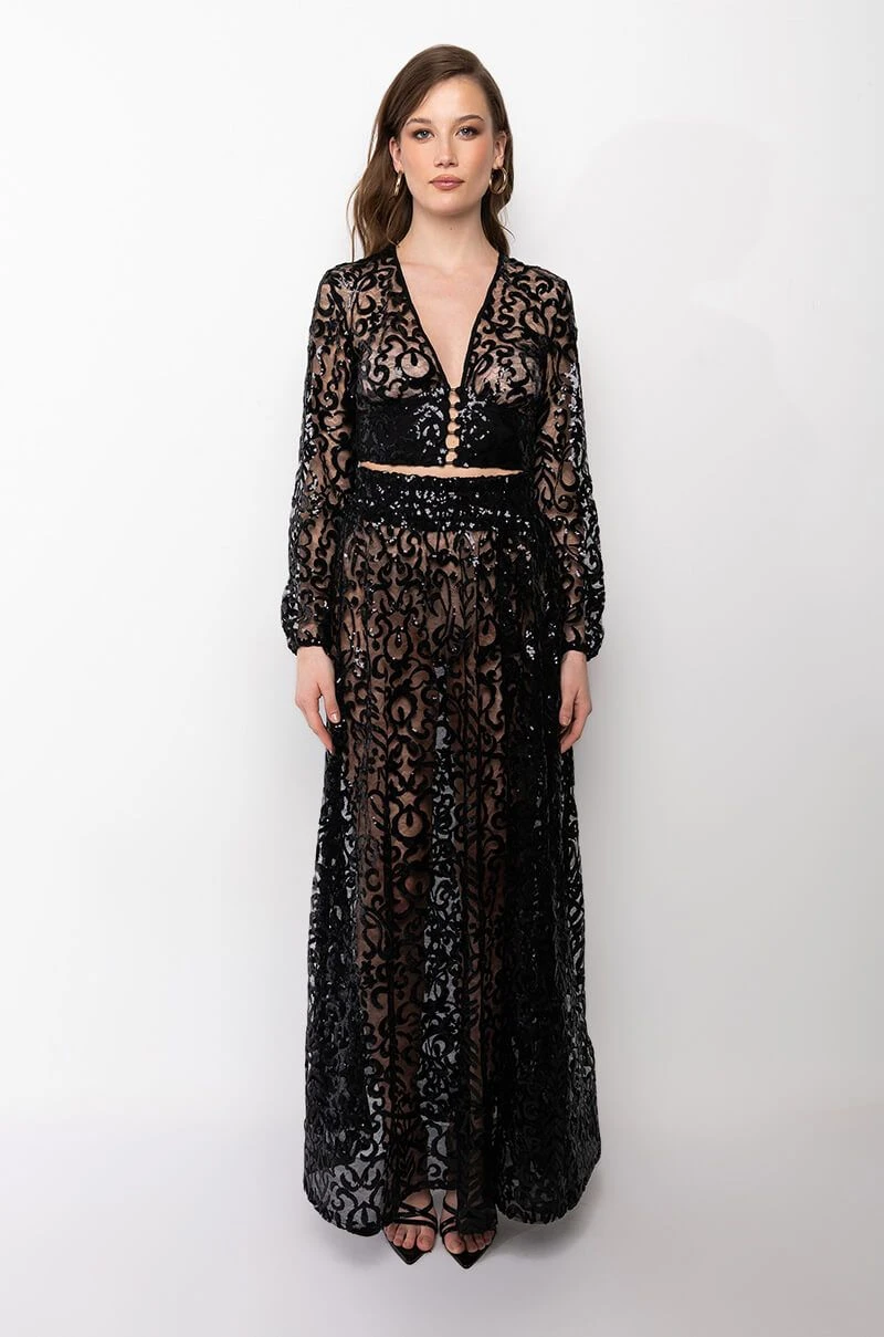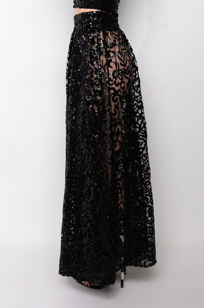 The AKIRA Label Estelle Sequin Maxi Skirt features a structured yet sheer tulle base, maxi silhouette, and an off center high slit. Complete with an elasticized waistband for an hourglass cut and sequin brocade detailing. Pair this piece with the coordinating Estelle Sequin Blouse, a sleek bodysuit, and a PVC pump.