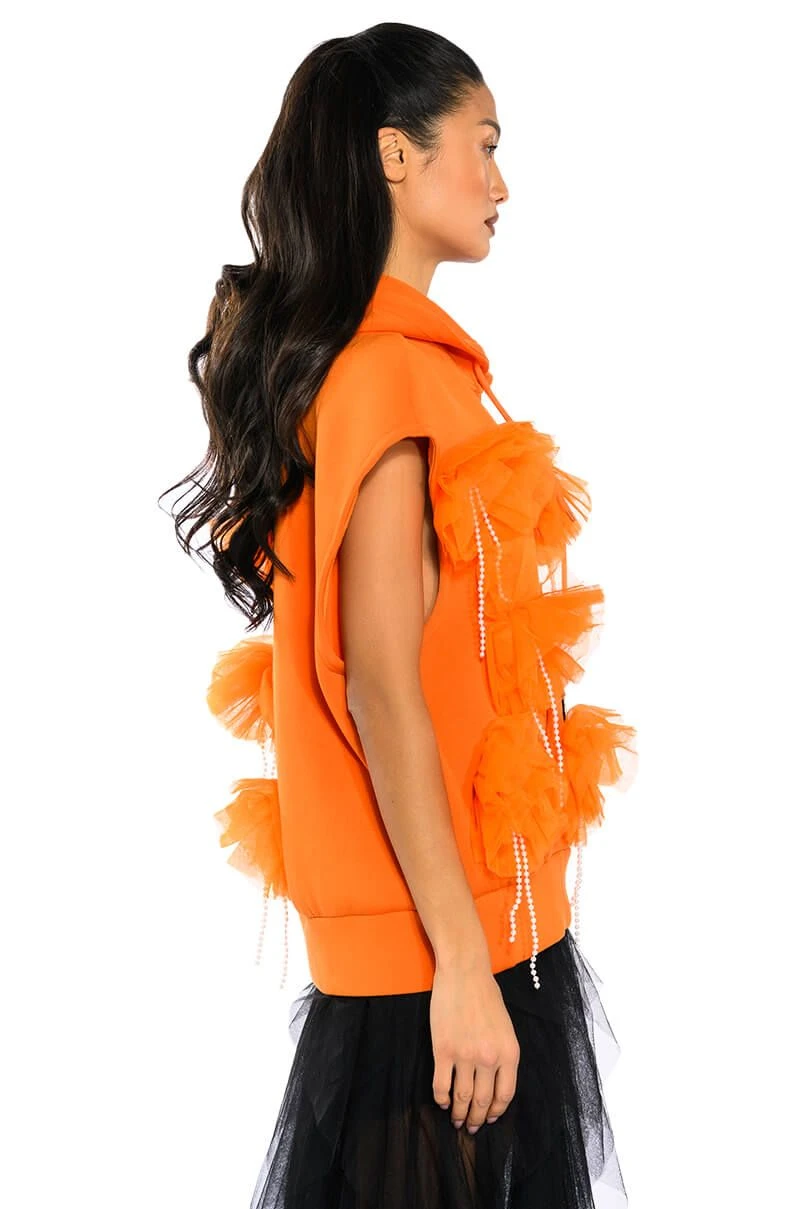 The AKIRA Label Euphoric Embellished Sleeveless Sweatshirt is made from a scuba fabrication and features an attached drawstring hood, a sleeveless silhouette, a boxy design, a mock kangaroo front pocket, and a wide waistband. Complete with a sequin heart eye decal and front and back pearl fringe mesh rosettes.