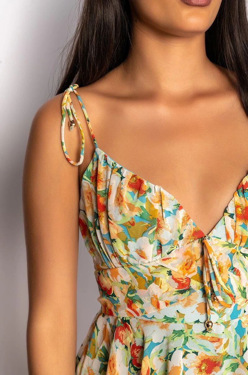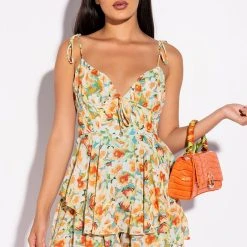 You can have it all in The AKIRA Label Everything And More Floral Romper! This sweet, romantic piece is made from a flowy fabrication and features a multicolor floral print, tie spaghetti straps with beads, a plunge neckline with pleated cups and a beaded tie detail, a thick cross front waistband with tie, a layered ruffle chiffon overlay, inner shorts, and a tonal back zipper closure.