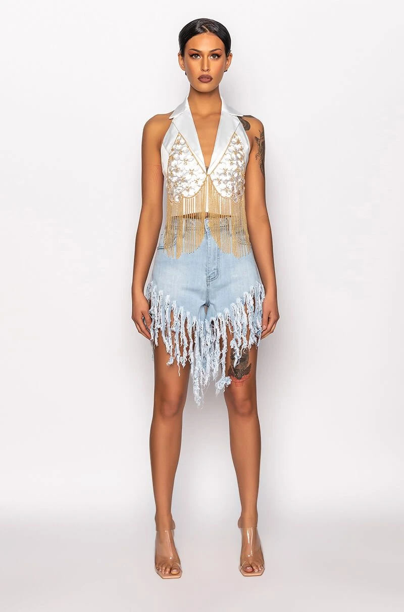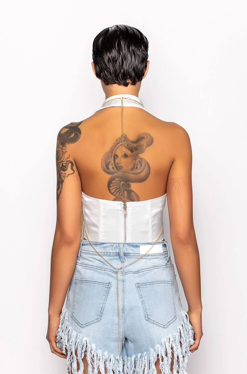 Unleash the dancer within in The AKIRA Label Fantasy Drip Link Bra Body Chain! This performance-worthy piece features a bralette silhouette, clear acrylic stones, a faux gold chain link base, a halter neck design, back chain link fastening, and fringe chain detailing. Complete with dual lobster claw closures. Style this piece over a sleek bodysuit or strapless dress to add some glam shimmer to your look.