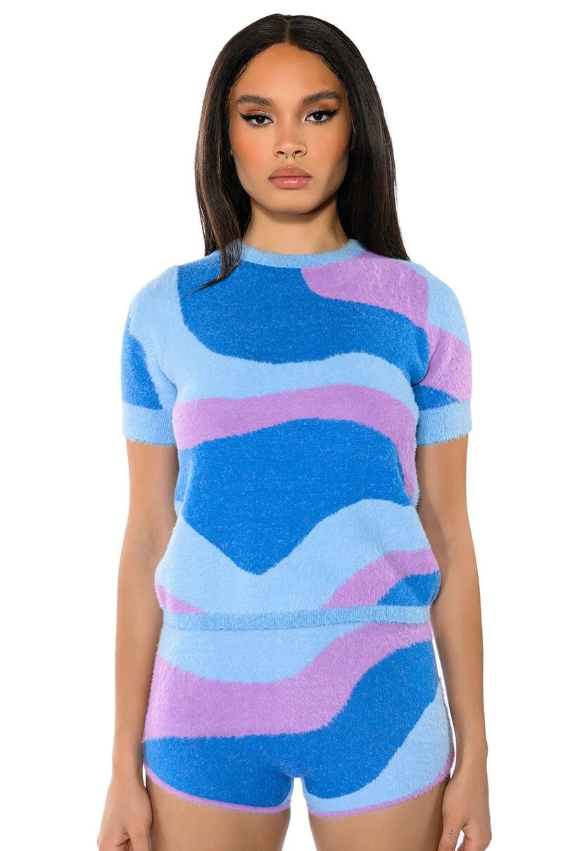 The AKIRA Label Far Out Knit Hot Pants feature a leg-baring, mini hem, a high rise silhouette, and a fuzzy knit fabrication. Complete with an abstract print pattern and a wide elastic waistband. Pair with the coordinating AKIRA Label Far Out Short Sleeve Sweater and the Far Out Tie Cardigan.