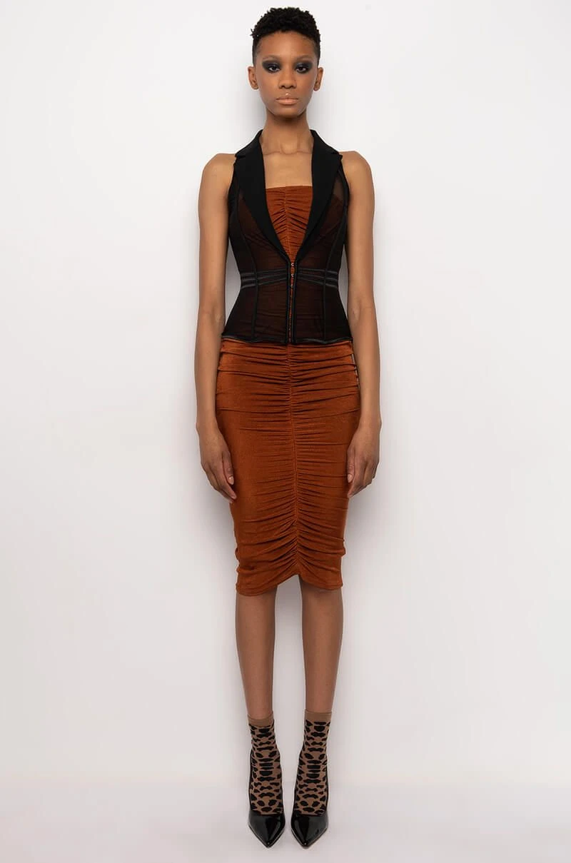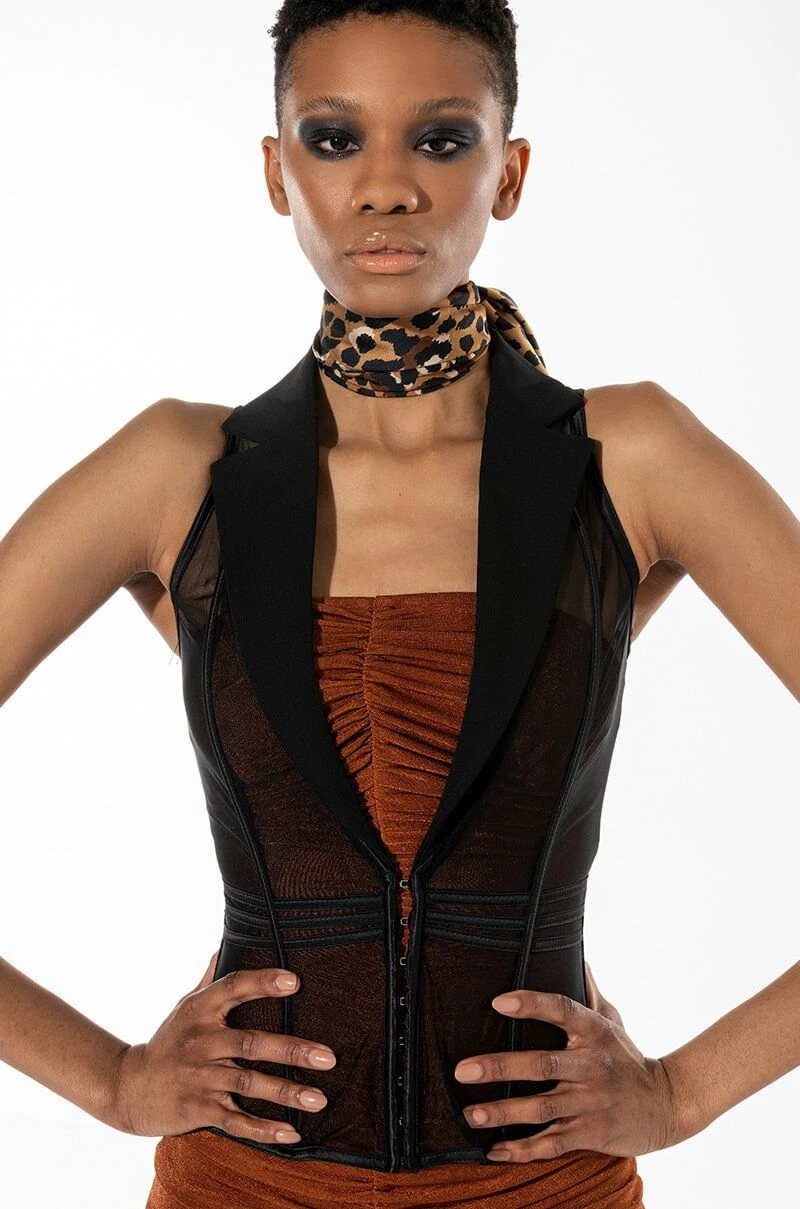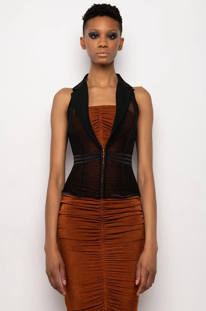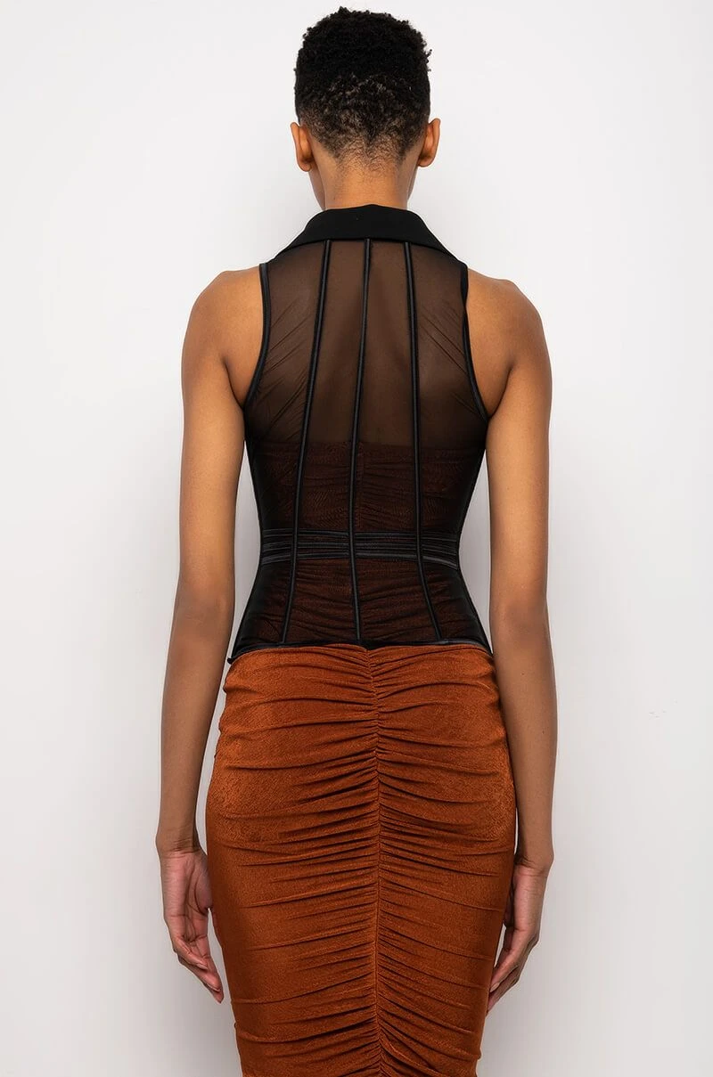 Steal the style spotlight with The AKIRA Label Fashion Heist Mesh Corset Vest. This sheer mesh piece features a sleeveless design, a collared neckline, a longline silhouette, and hook and eye front closures. Complete with satin piping, structured boning, and a nipped in waist. Style it with your fave mini dresses and square toe sandals for a complete look.
