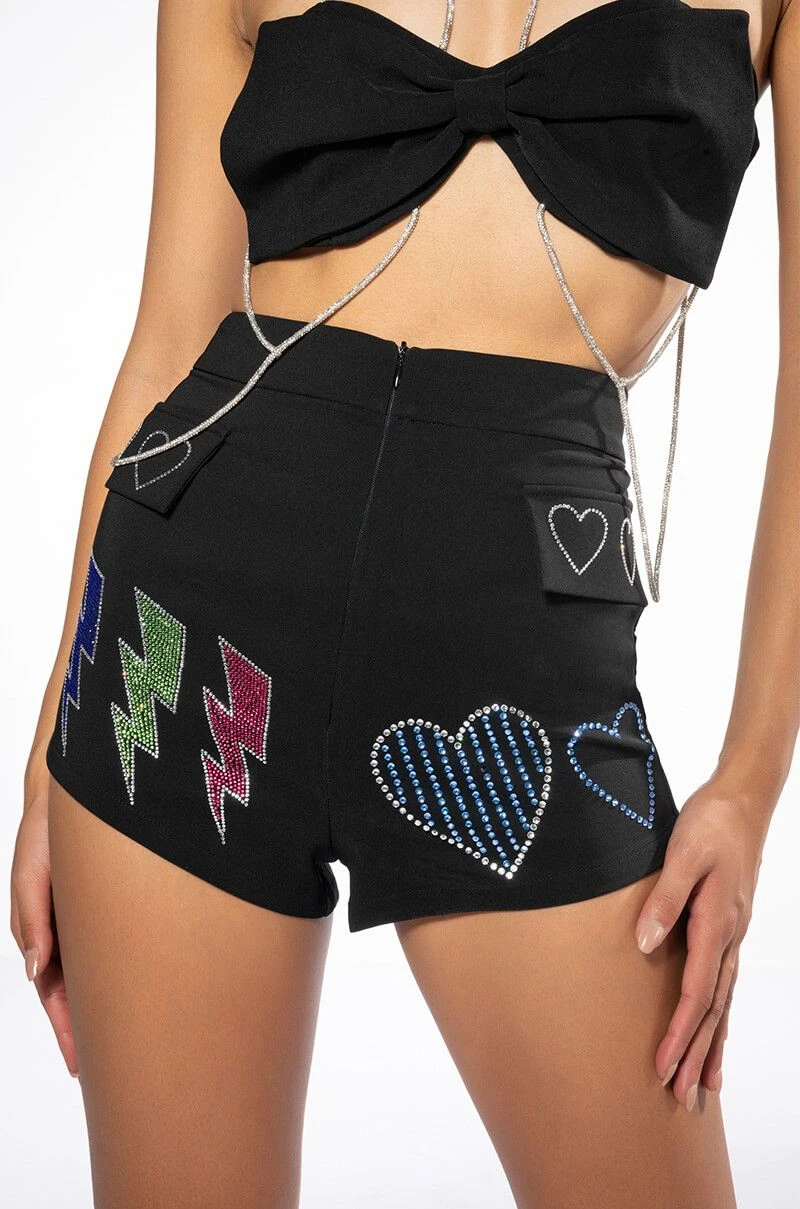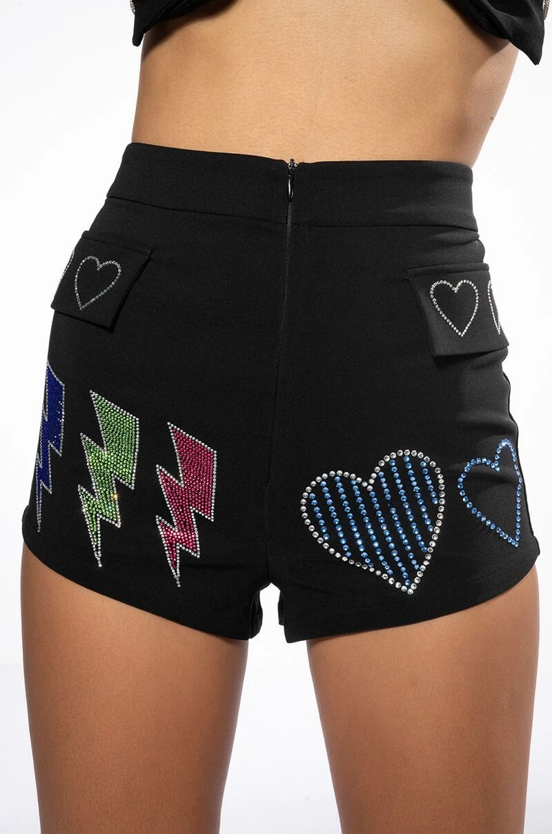 The AKIRA Label Flashing Lights Rhinestone Embellished Booty Short is made from a lightweight fabrication and features multicolor emoji-shaped rhinestone embellishments, a high rise waist, a wide waistband, mock front flap pockets, and a tonal front zipper closure. Pair this piece with the matching AKIRA Label Flashing Lights Rhinestone Embellished Blazer and Flashing Lights Rhinestone Rope Bralette to complete your look.