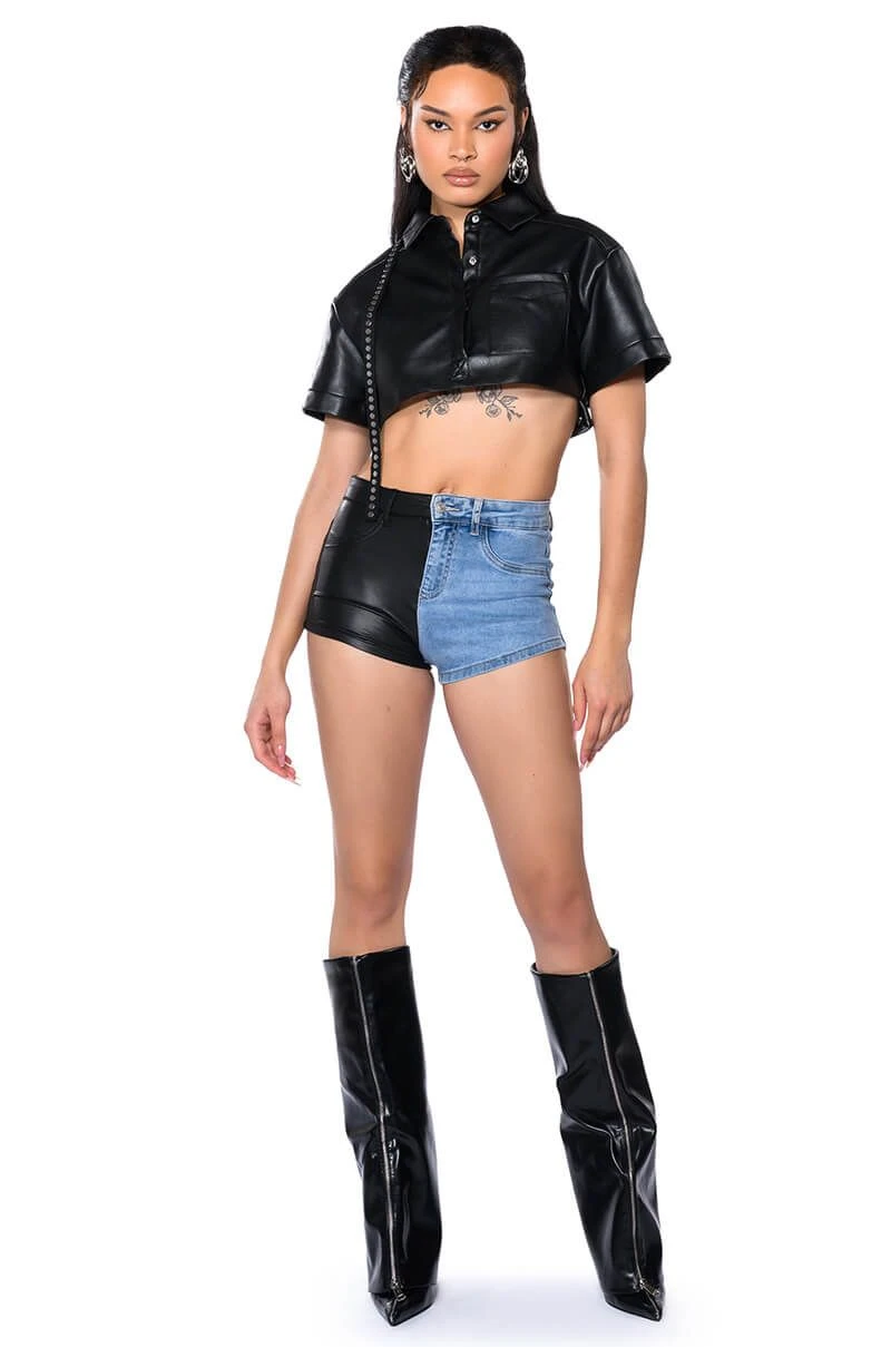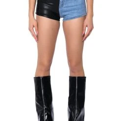You get the best of both worlds with The AKIRA Label Flex Fit Extreme Stretch Faux Leather And Denim Shorts! These ultra-stretchy denim bottoms feature a curve-hugging stretch denim knit construction, a high rise waist, a faux leather leg and back pocket, a classic zip button closure, and functioning belt loops. Style with your fave graphic crop tops and sleek ankle booties for a casual moment that puts your sexy self front and center.