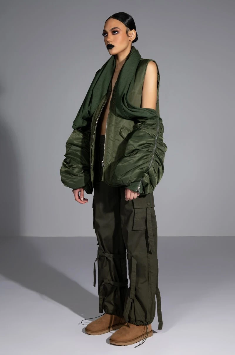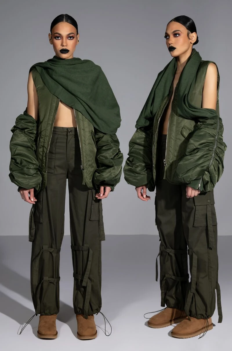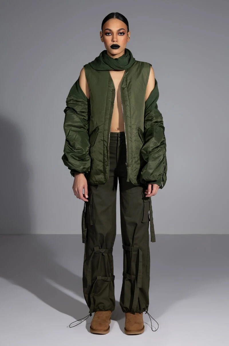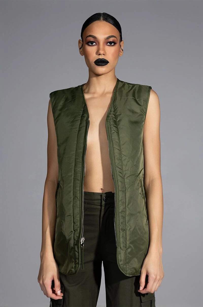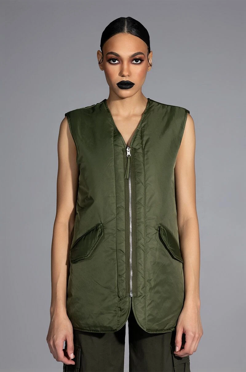 The AKIRA Label Flip The Script Reversible Nylon Combat Vest is made from a slick nylon fabrication and features a V neckline, a sleeveless silhouette, and a reversible design that has slant pockets on one side, flap pockets on the other, or vice versa! Complete with a reversible slider zipper front closure. Layer this seasonal staple over your fall fits to add some cushion and structure to your look.