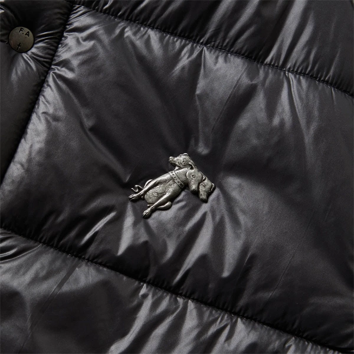 Antique Nickel “Fluffy Dog” Metal Pin at Chest on this puffer from FA.