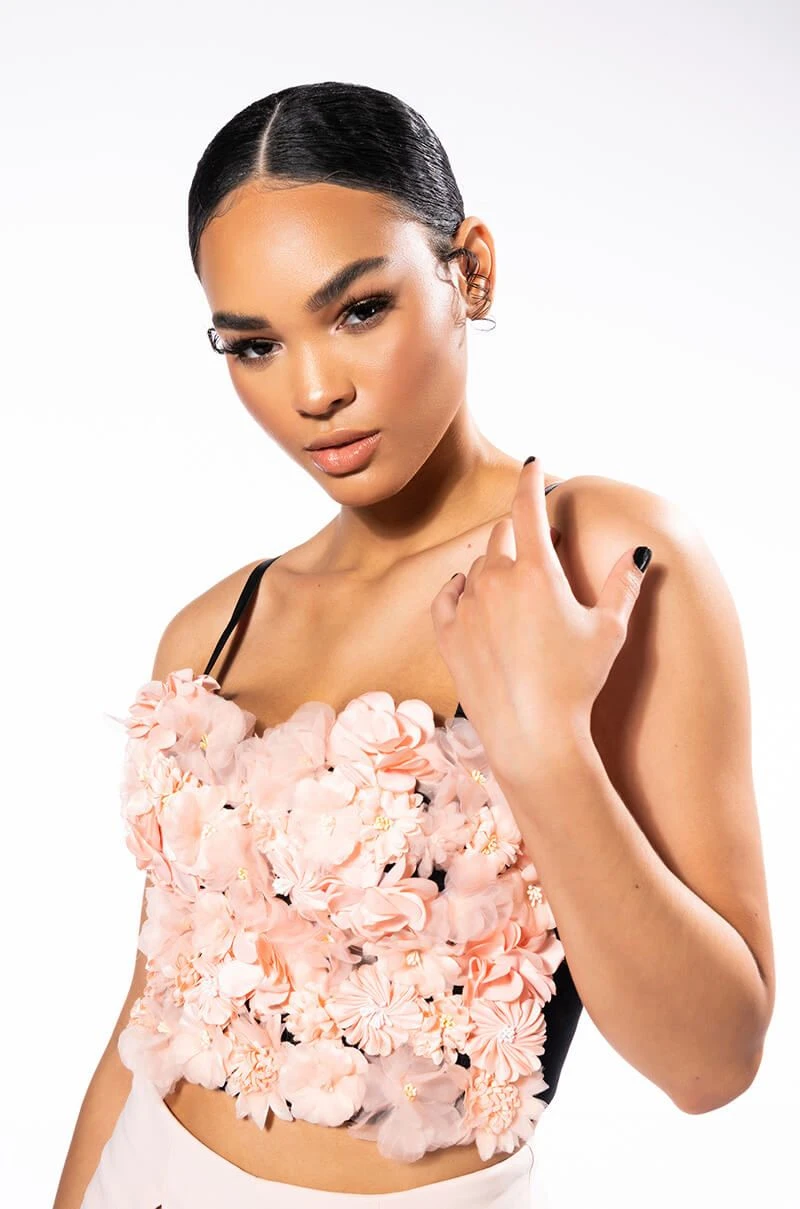 Like a bouquet for your wardrobe. The AKIRA Label Full Bloom Floral Crop Top features a sleek and stretchy fabrication, a boned bodice, padded push up bust cups, removable, adjustable tank straps, a sweetheart neckline and hook and eye back closures. Complete with three-dimensional floral applique detailing, a cropped cut, and elastic inner trim for a secure fit.