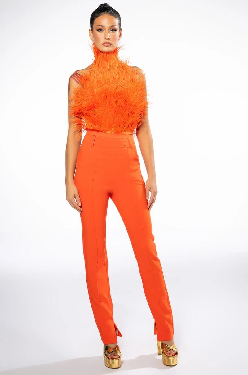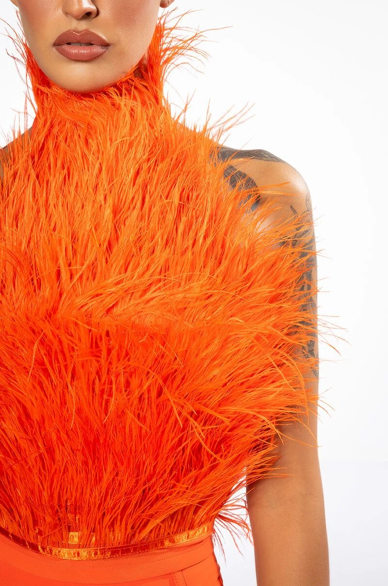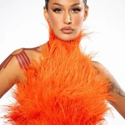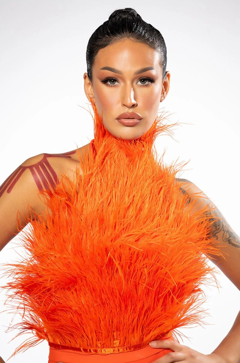 The AKIRA Label Genuine Ostrich Feather Sleeveless Cropped Halter Blouse in Orange is made from a stretchy mesh fabrication and features layered opulent ostrich feathers throughout, a halter neckline with back button detailing, a sleeveless silhouette, an elastic hem, a sexy open back, and a cropped length. Complete with an exposed back zipper closure. Pair this piece with satin bottoms and pumps to complete your look.
