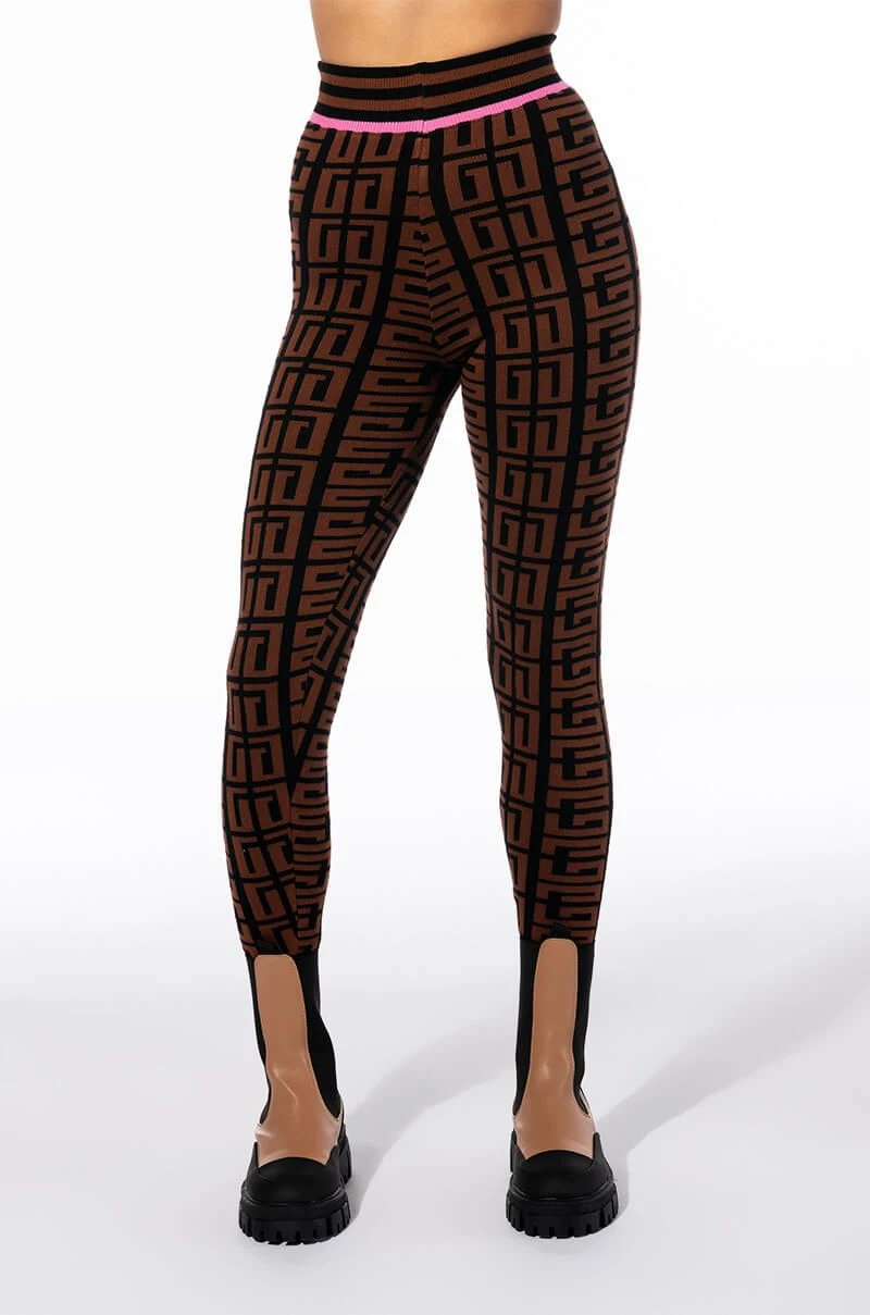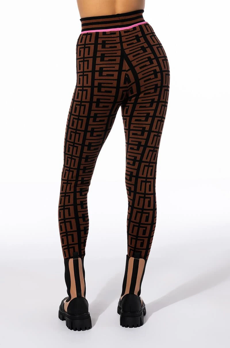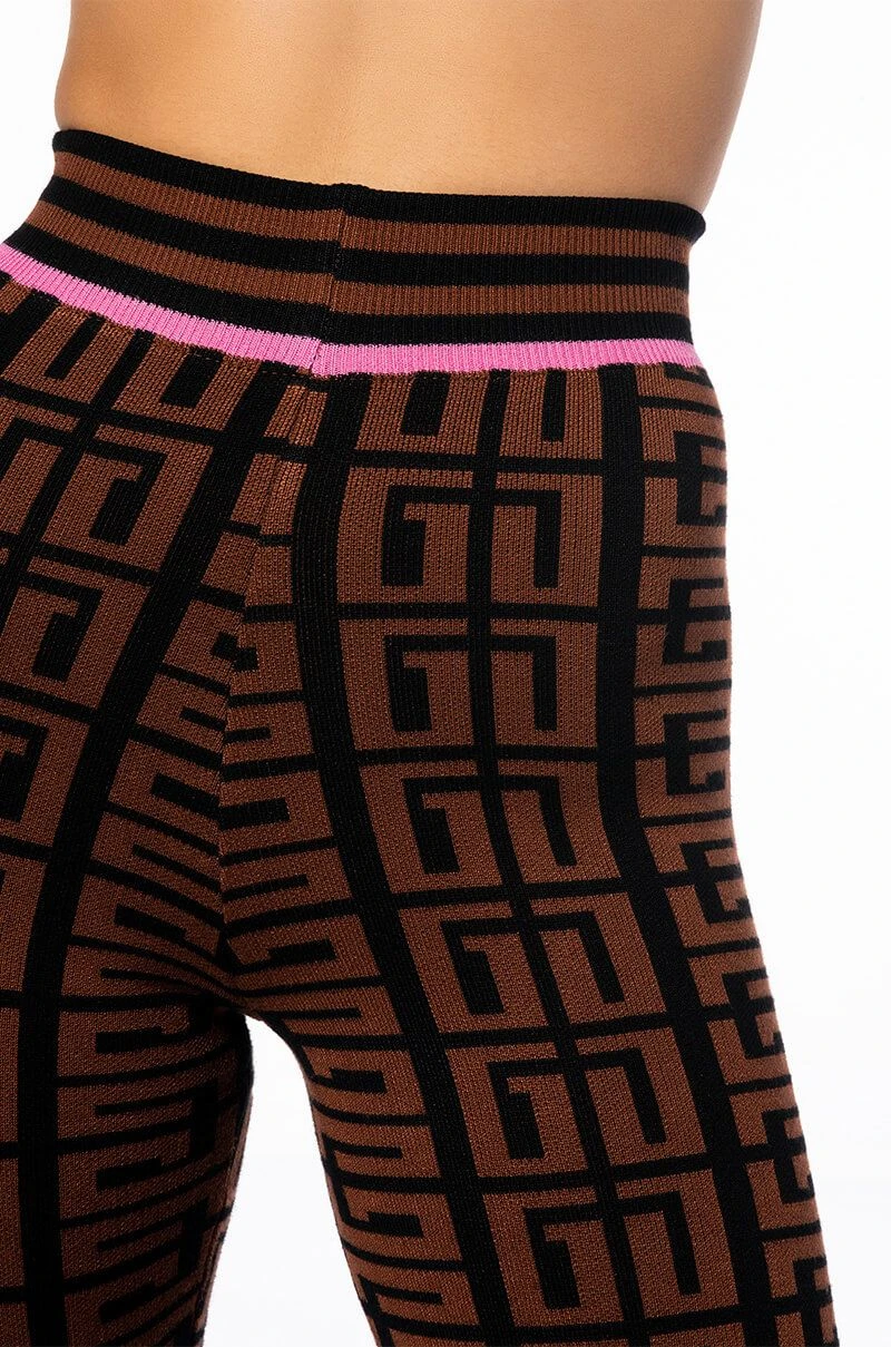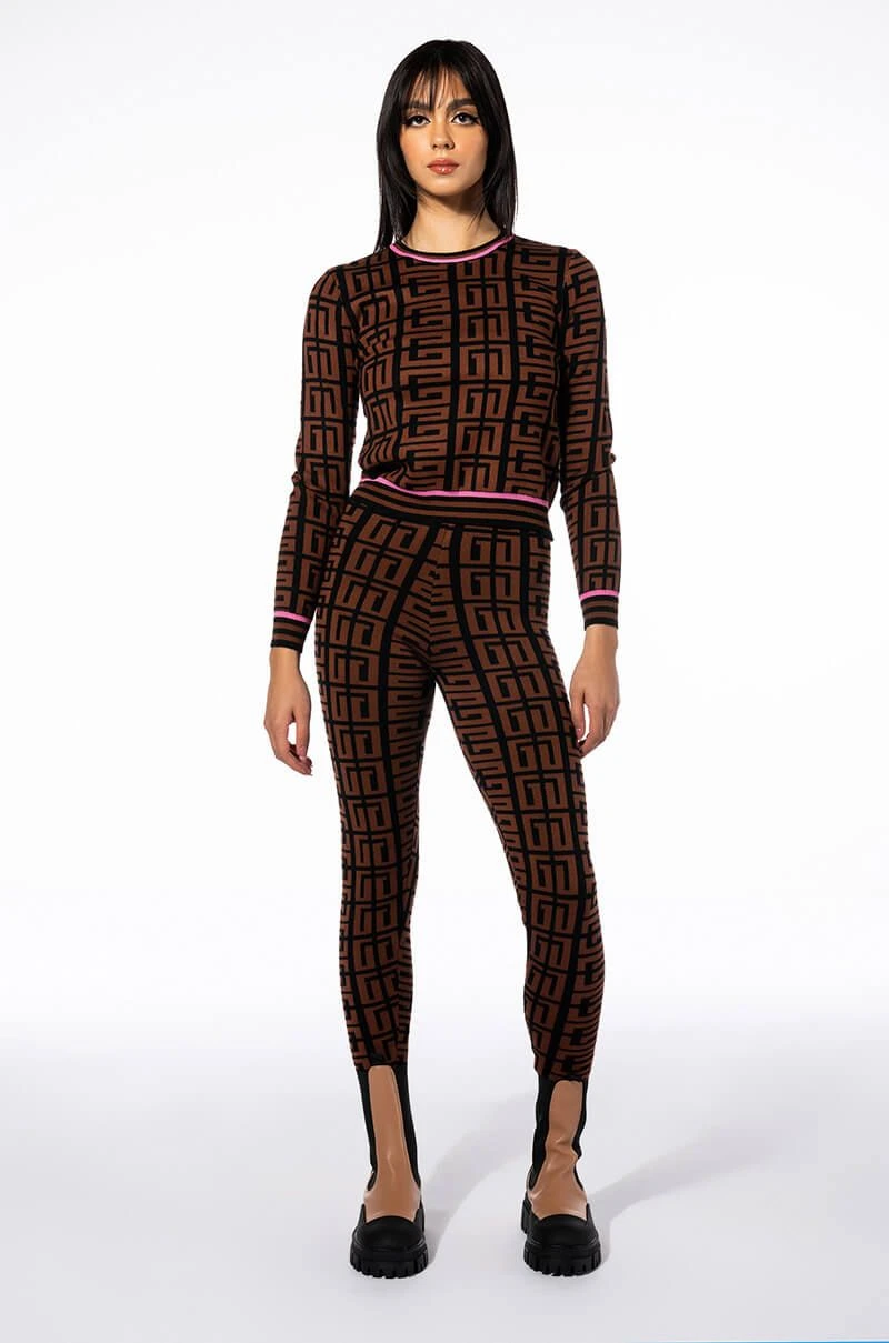 Graphic glam meets cozy chic with Try The AKIRA Label Get In Line Sweater Legging. This classic loungewear piece features a knit base, high waist rise, elastic waistband, bodycon fit, ribbed knit hems, and a geometric print. Pair with the coordinating AKIRA Label Get In Line Crewneck Sweater and chunky sneakers to complete the look.
