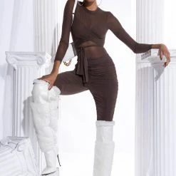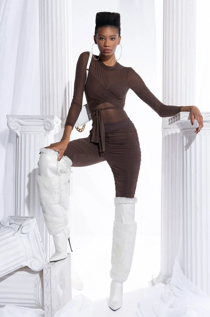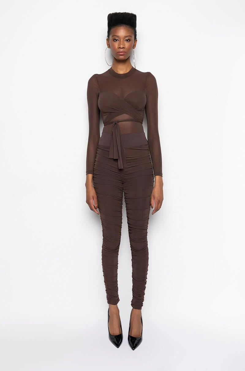 The AKIRA Label Get It Right Get It Mesh Pant features a lined stretch mesh fabrication, ruched details up the sides and center, an elastic waistband, and ankle length bodycon silhouette. Pair with the coordinating Get It Right Get It Mesh Tie Front Bodysuit.