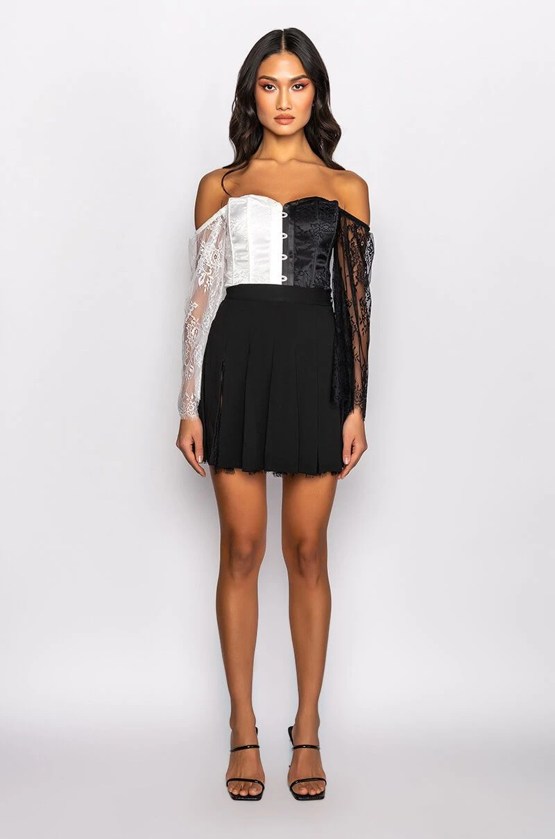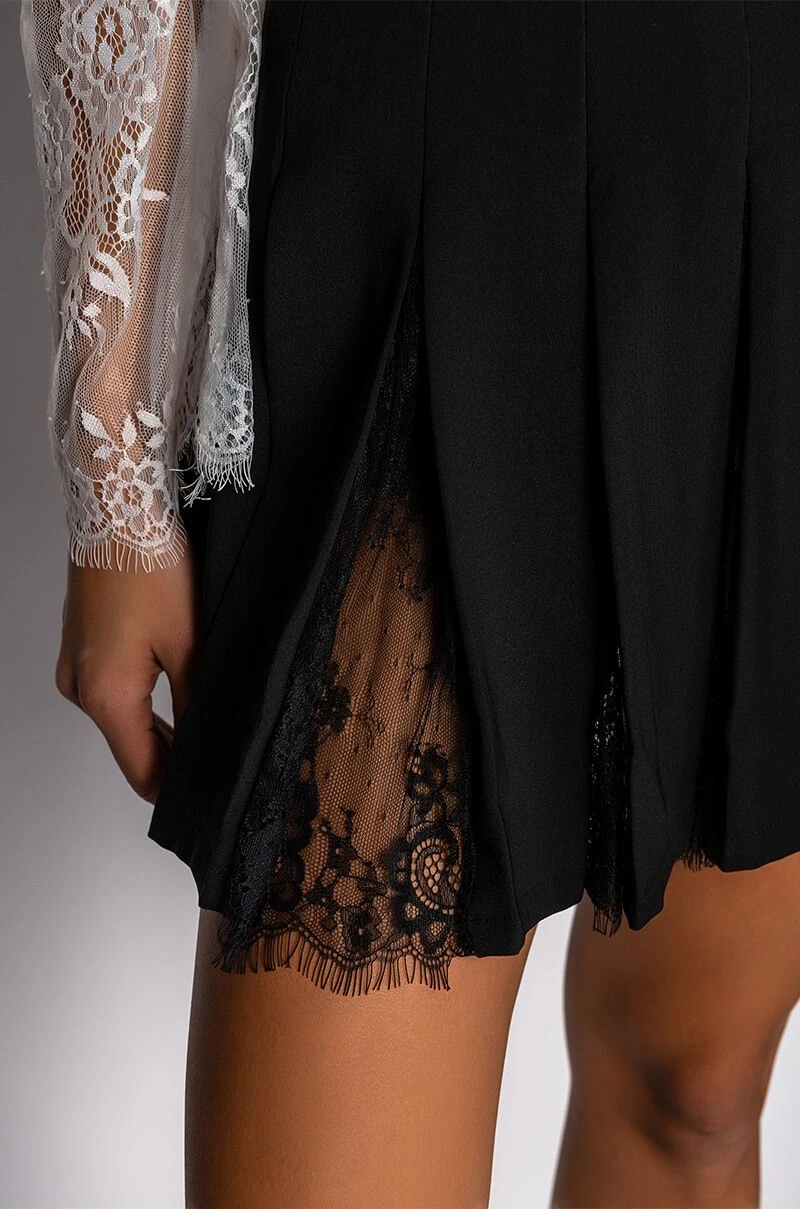 The AKIRA Label Ginger Lace Pleated Mini Skirt features a classic stretch knit fabrication, a pleated design, lace cut out pleated panel detailing, a side zipper closure, and a high rise waistline. Complete your look with a cropped blouse and strappy sandals.