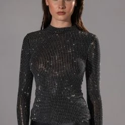 Stand out and shine on in The AKIRA Label Glitz Long Sleeve Mesh Top. This sheer, long sleeve mock neck top features a waist length silhouette, rhinestone pinstripe detailing, and long sleeves. Pair with a bralette, pleather pants, and a moto jacket.