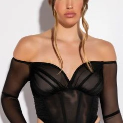 The AKIRA Label Good 4 U Long Sleeve Mesh Bustier is made from a sheer mesh fabrication, and is complete with wired v neckline, corset boning for structure, long sleeves, and a back zipper closure.