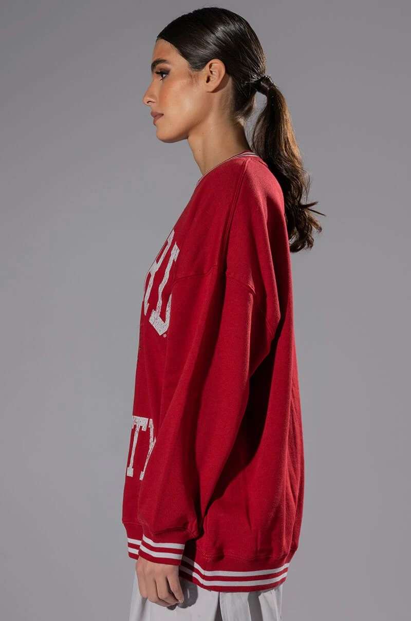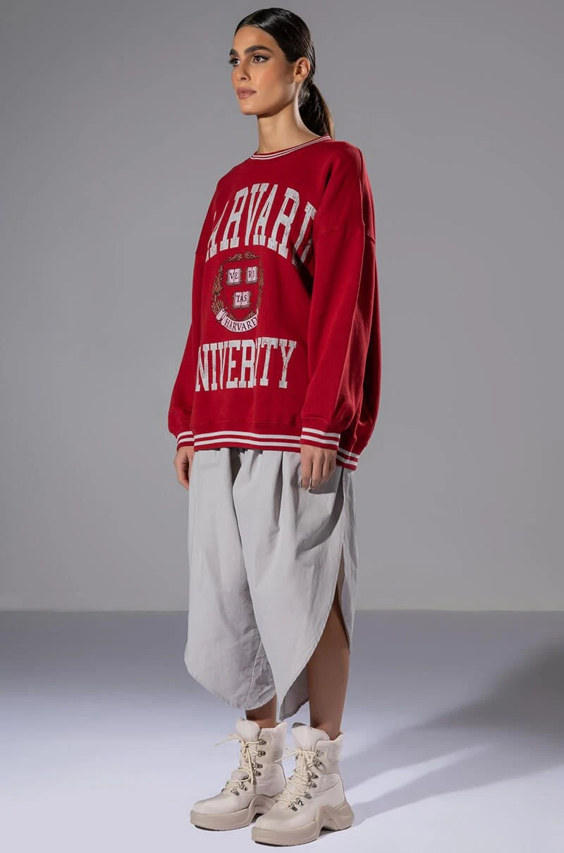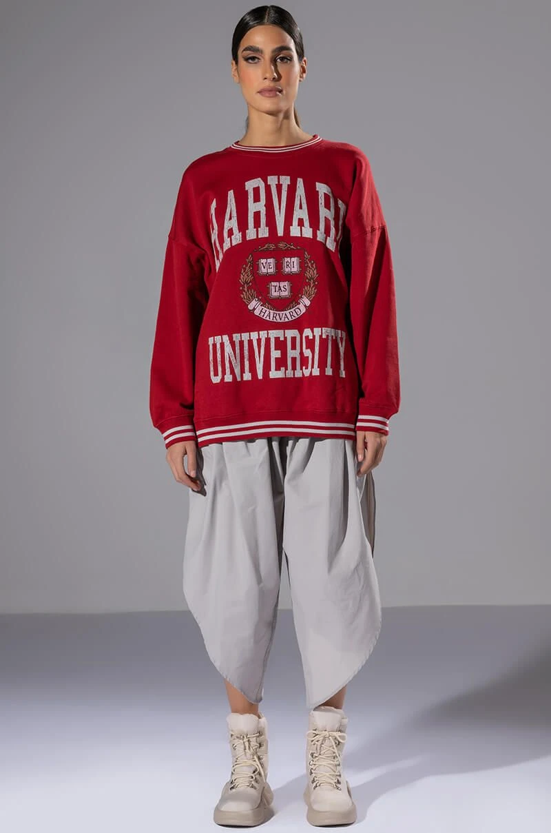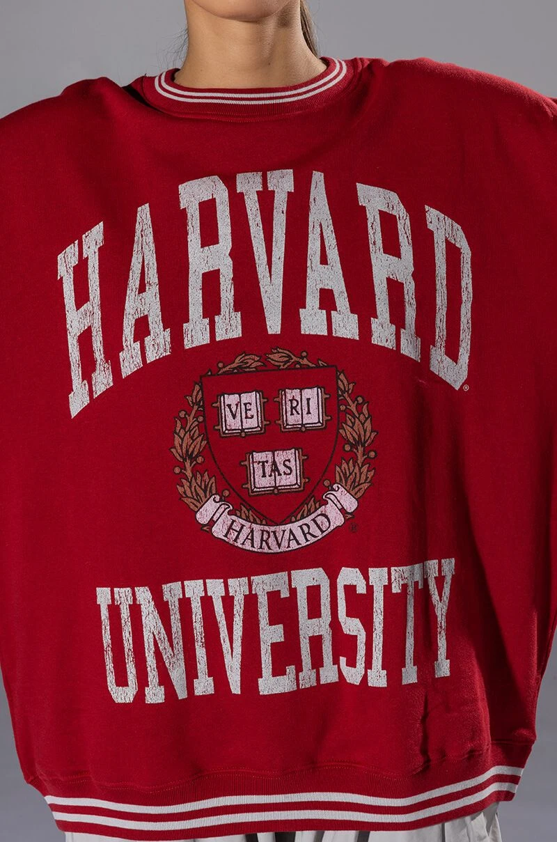 The AKIRA Label Harvard Oversized Sweatshirt is a soft, fleece-lined sweater featuring a cozy sweatshirt fabrication, an oversized design, and a crew neckline. Complete with “Hard University,” faux aged graphic, and striped elasticized hems. Complete your look with high rise leggings and UGGS for a collegiate look.
