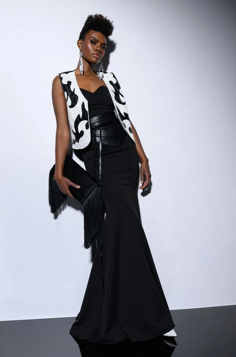 The AKIRA Label Heart In The Highlands Western Faux Leather Vest is made from a pebbled faux leather fabrication and features colorblock, Western-inspired embroidered pattern detailing, a sleeveless silhouette, a racerback design, polyester lining, and an open front. Pair this piece with a knit midi dress and Western booties to ride off into the sunlight in style.
