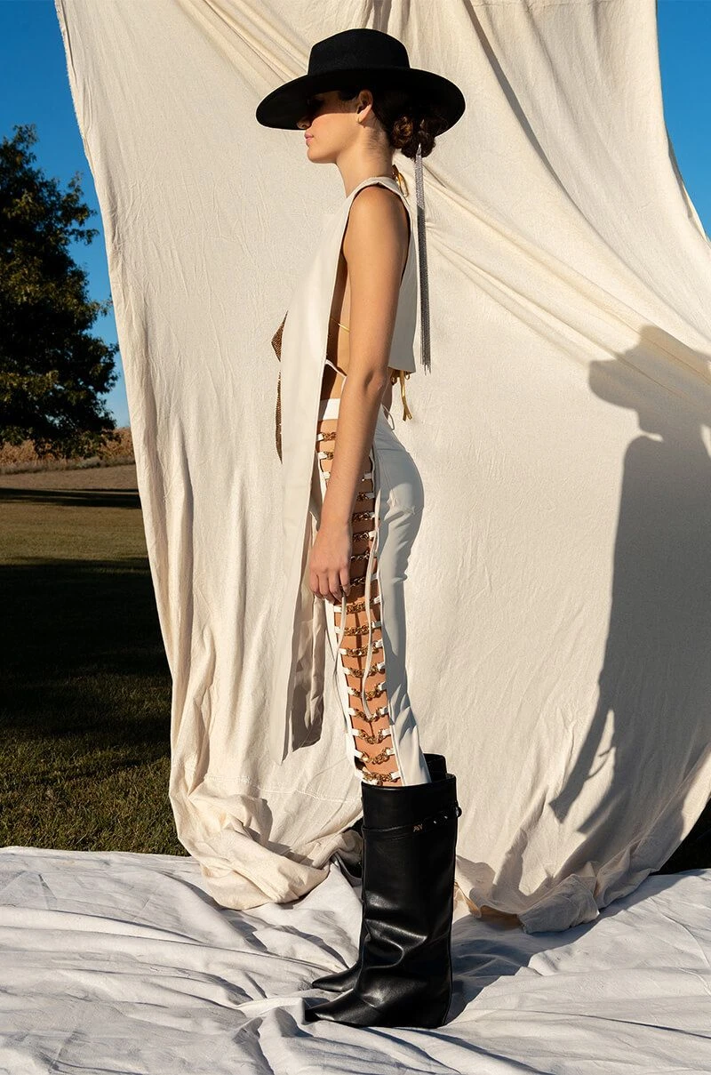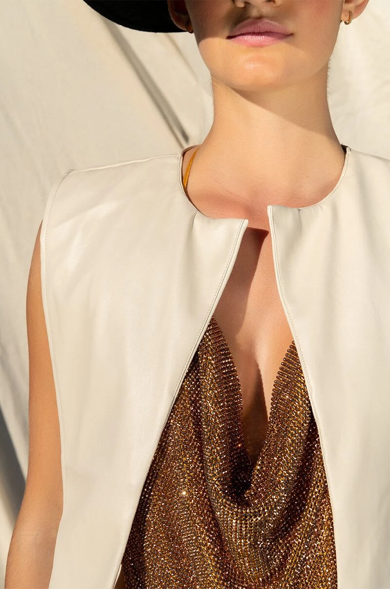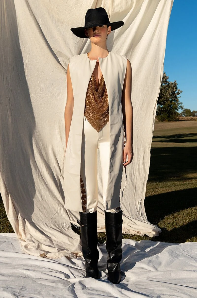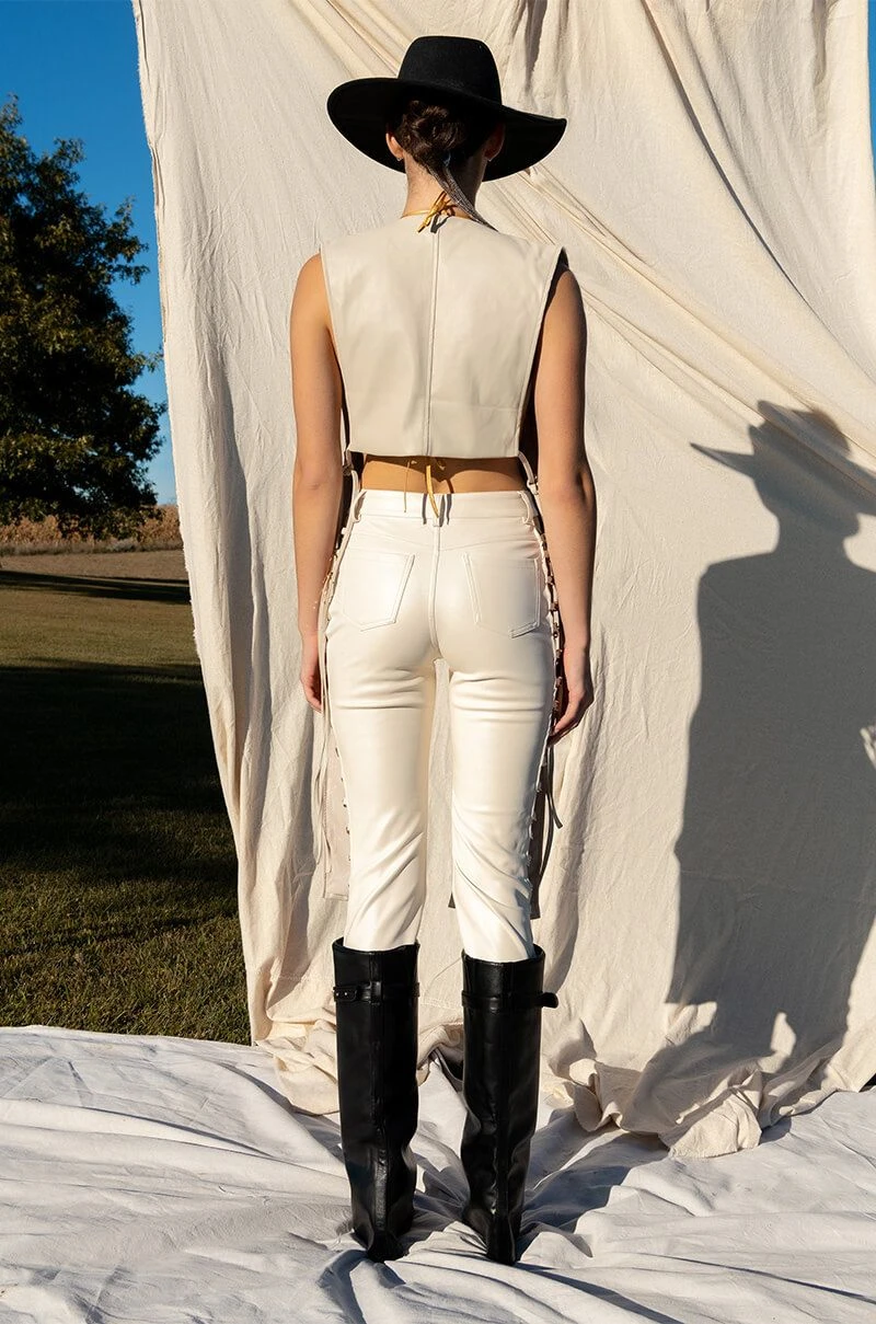 The AKIRA Label Henny PU Split Vest is made from a soft faux leather fabrication and features a sleeveless design, an open silhouette, cropped length, a long front drape detail, polyester lining, and tie back straps at the waist and back. Style this chic piece with your fave midi dresses and square toe sandals for a complete look.