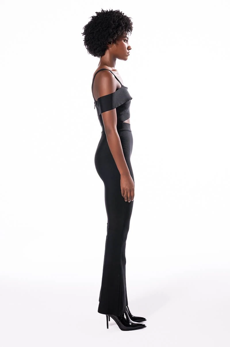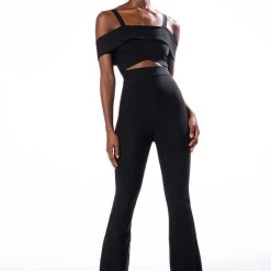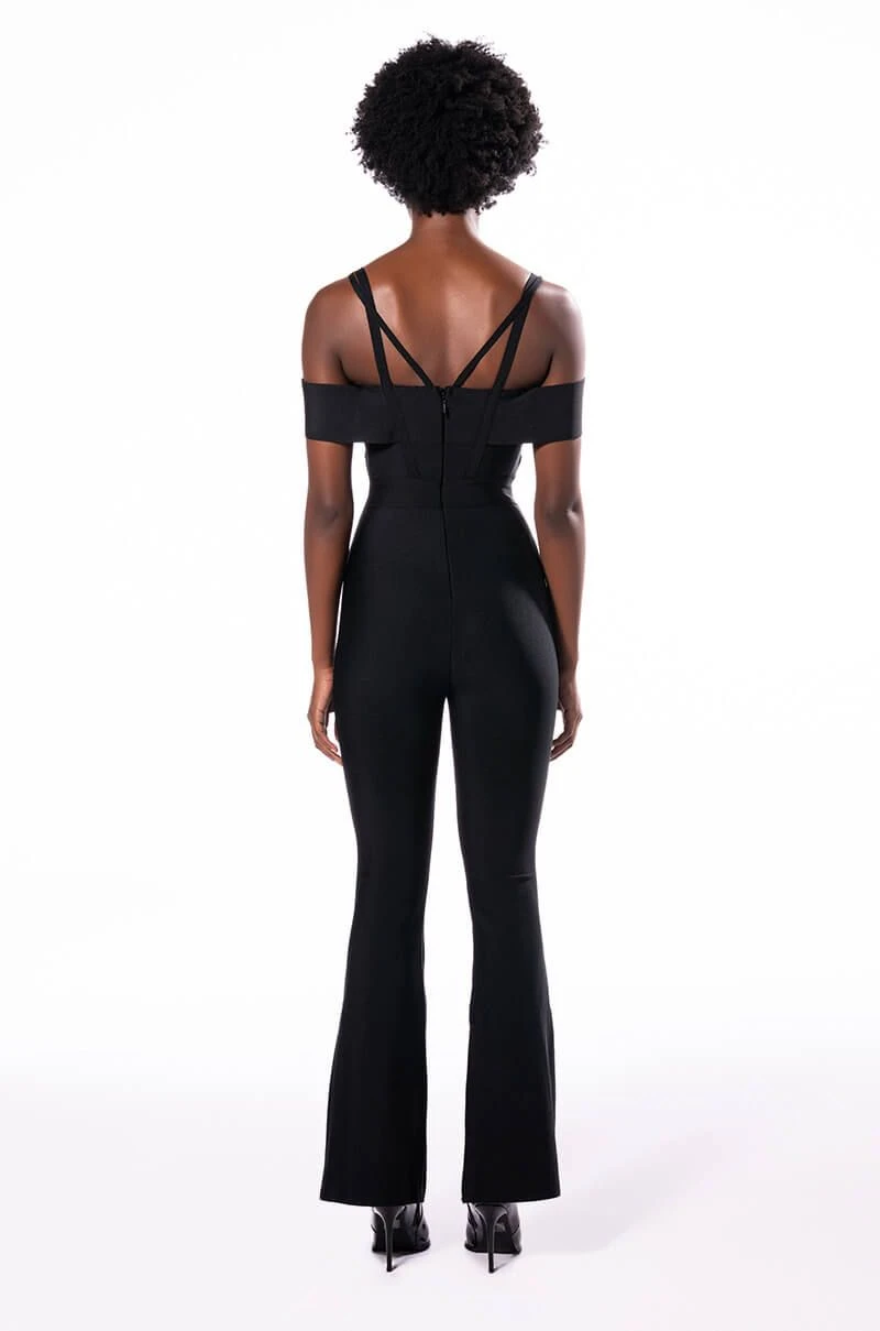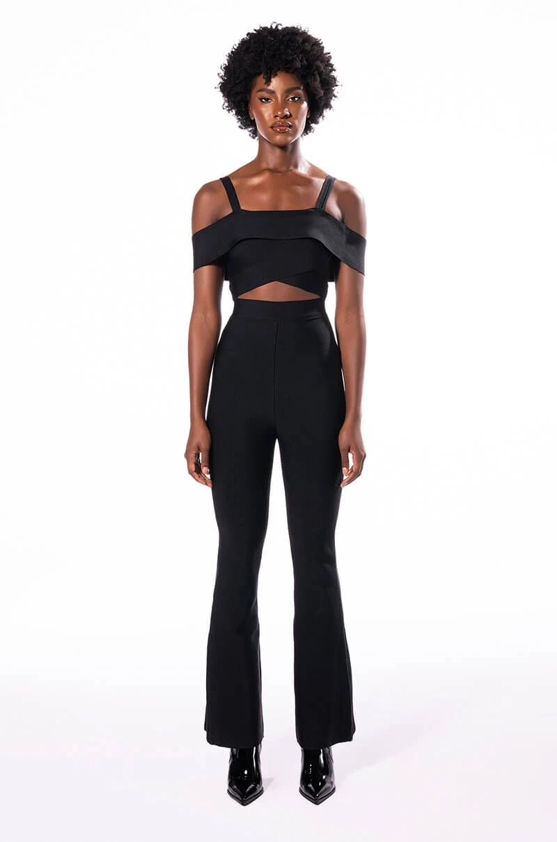 Wave to the haters in The AKIRA Label Hey There Bandage Jumpsuit With Cut Out! This sleek one piece is made from a fitted bandage fabrication and features tank straps, a straight off the shoulder neckline, a cross front bodice with a sexy chest cutout, slightly flared legs, and a strappy back. Complete with a tonal back zipper closure.