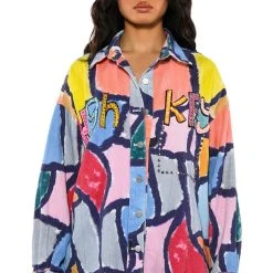 The AKIRA Label High Key Abstract Button Down Blouse is made from a structured, lightweight fabrication with an all over colorful and bold abstract design. This piece features a pointed collar, long sleeves with buttoned cuffs, and a graphic print of ‘High Key’, embellished with beads, rhinestones, and sequins. Complete with a longline silhouette, an oversized design, rounded hems, and a button down front closure. Pair this bold top with pleather pants and booties for that wow effect!